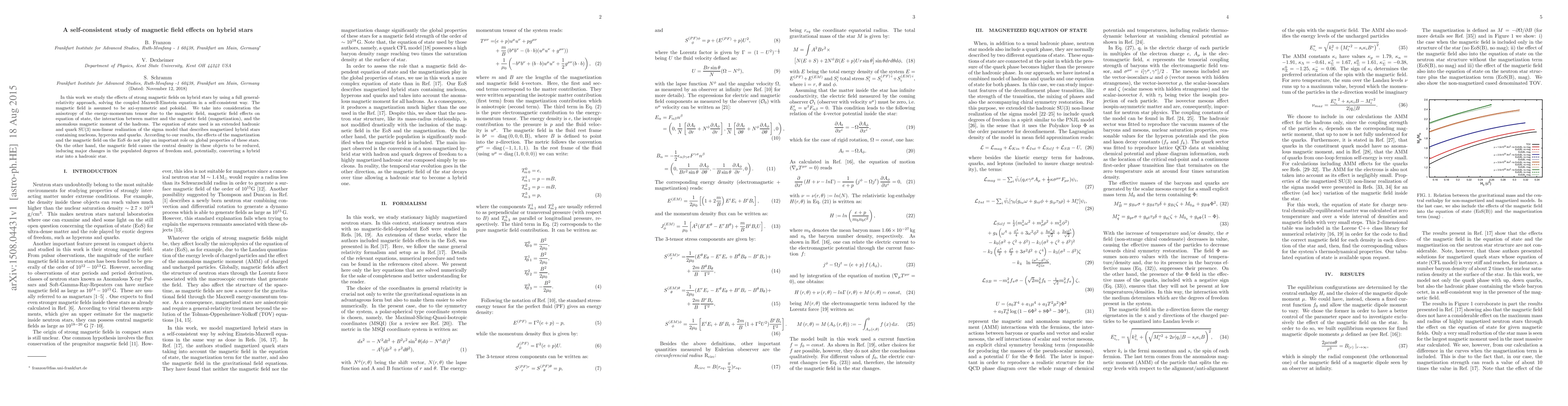 In this work we study the effects of strong magnetic fields on hybrid stars by using a full general-relativity approach, solving the coupled Maxwell-Einstein equation in a self-consistent way. The magnetic field is assumed to be axi-symmetric and poloidal. We take into consideration the anisotropy of the energy-momentum tensor due to the magnetic field, magnetic field effects on equation of state, the interaction between matter and the magnetic field (magnetization), and the anomalous magnetic moment of the hadrons. The equation of state used is an extended hadronic and quark SU(3) non-linear realization of the sigma model that describes magnetized hybrid stars containing nucleons, hyperons and quarks. According to our results, the effects of the magnetization and the magnetic field on the EoS do not play an important role on global properties of these stars. On the other hand, the magnetic field causes the central density in these objects to be reduced, inducing major changes in the populated degrees of freedom and, potentially, converting a hybrid star into a hadronic star.