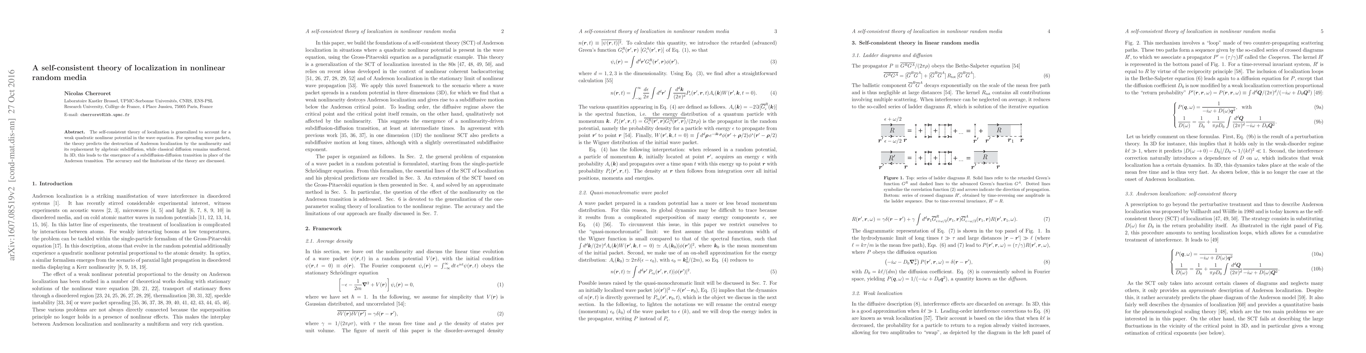 This paper develops a self-consistent theory explaining how weak quadratic nonlinearity in random media disrupts Anderson localization, replacing it with algebraic subdiffusion, while classical diffusion remains unchanged, leading to a subdiffusion-diffusion transition in 3D. The paper also discusses the theory's accuracy and limitations.