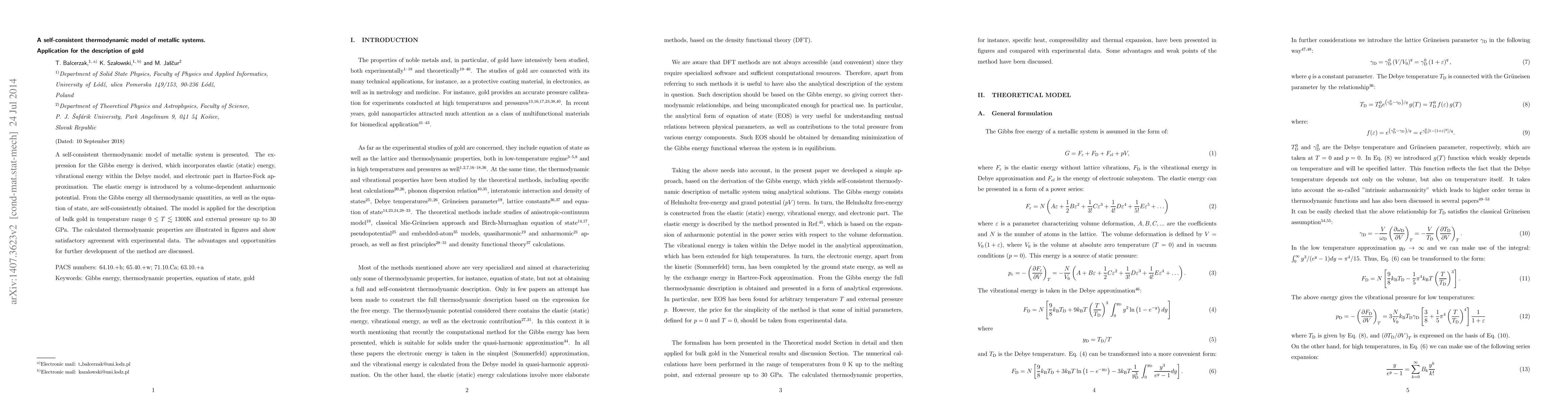 This paper presents a self-consistent thermodynamic model for metallic systems, incorporating elastic, vibrational, and electronic energy components. The model accurately describes bulk gold's thermodynamic properties over a wide temperature and pressure range, showing good agreement with experimental data.