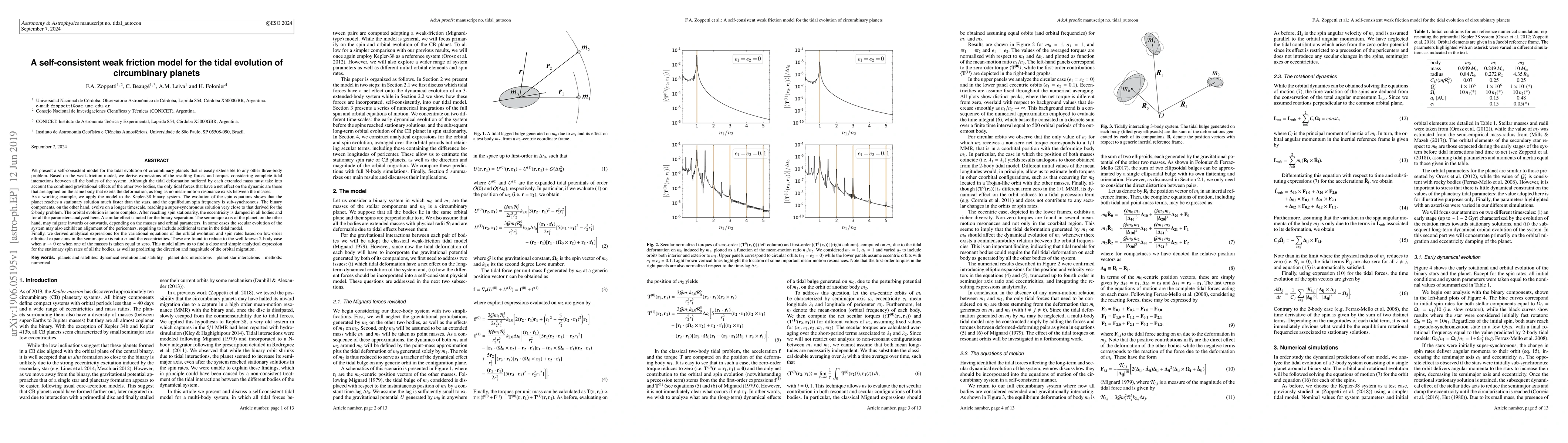 We present a self-consistent model for the tidal evolution of circumbinary planets. Based on the weak-friction model, we derive expressions of the resulting forces and torques considering complete tidal interactions between all the bodies of the system. Although the tidal deformation suffered by each extended mass must take into account the combined gravitational effects of the other two bodies, the only tidal forces that have a net effect on the dynamic are those that are applied on the same body that exerts the deformation, as long as no mean-motion resonance exists between the masses. We apply the model to the Kepler-38 binary system. The evolution of the spin equations shows that the planet reaches a stationary solution much faster than the stars, and the equilibrium spin frequency is sub-synchronous. The binary components evolve on a longer timescale, reaching a super-synchronous solution very close to that derived for the 2-body problem. After reaching spin stationarity, the eccentricity is damped in all bodies and for all the parameters analyzed here. A similar effect is noted for the binary separation. The semimajor axis of the planet, on the other hand, may migrate inwards or outwards, depending on the masses and orbital parameters. In some cases the secular evolution of the system may also exhibit an alignment of the pericenters, requiring to include additional terms in the tidal model. Finally, we derived analytical expressions for the variational equations of the orbital evolution and spin rates based on low-order elliptical expansions in the semimajor axis ratio and the eccentricities. These are found to reduce to the 2-body case when one of the masses is taken equal to zero. This model allow us to find a close and simple analytical expression for the stationary spin rates of all the bodies, as well as predicting the direction and magnitude of the orbital migration.