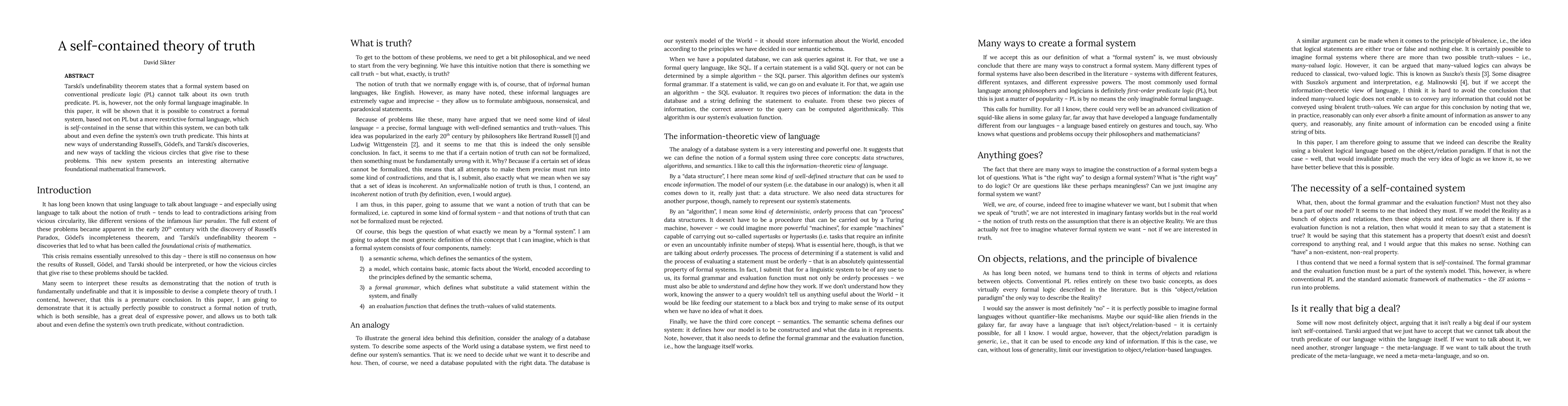 This paper proposes a self-contained formal system based on a more restrictive language than predicate logic, allowing it to define its own truth predicate, thus offering a novel foundational mathematical framework and new insights into classical logic paradoxes.