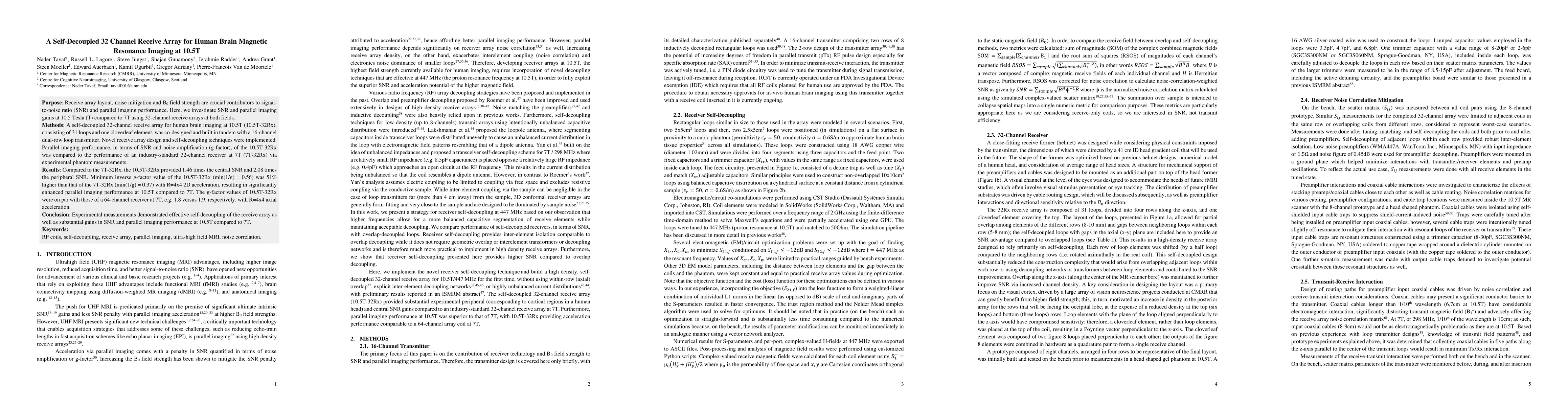 This research presents a 32-channel receive array designed for 10.5T MRI, significantly enhancing SNR and parallel imaging performance compared to a 7T standard. The array, featuring self-decoupling techniques, achieved 1.46 times central SNR, 2.08 times peripheral SNR, and a 51% higher minimum inverse g-factor (0.56 vs 0.37) than a 7T 32-channel array, akin to a 64-channel 7T array under 4x4 acceleration.