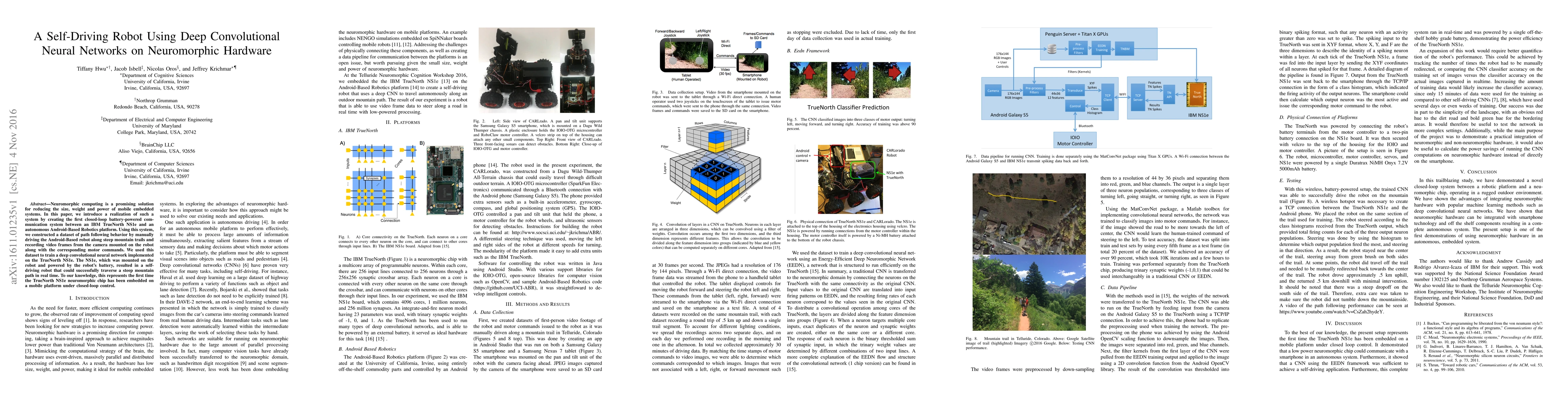 This work is novel as it represents the first instance of embedding the TrueNorth NS1e on a mobile platform under closed-loop control, integrating neuromorphic hardware with popular machine learning methods like deep convolutional neural networks, and achieving a complete autonomous system using off-the-shelf components.