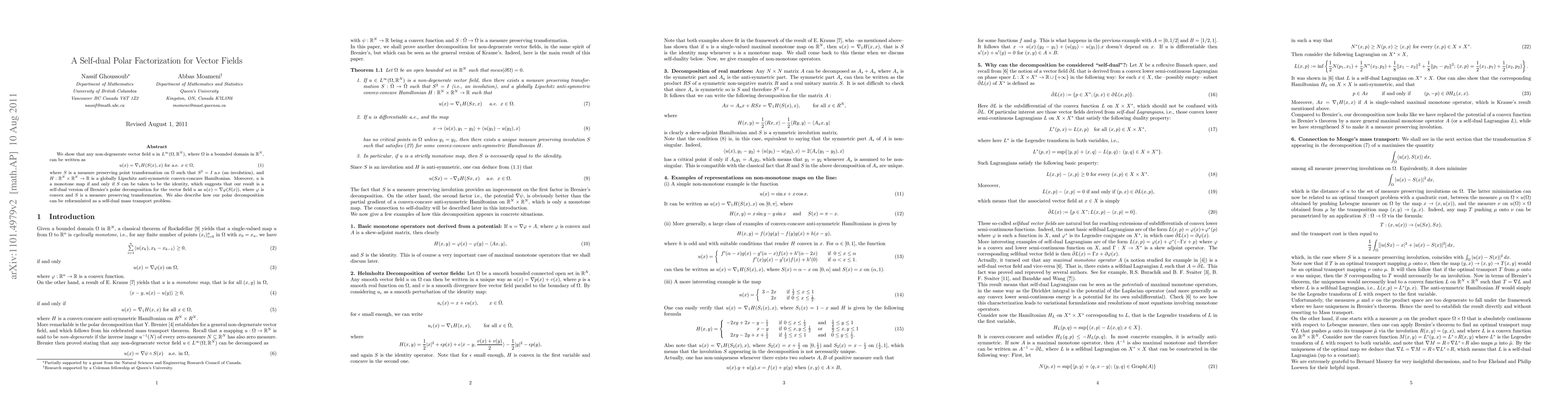 We show that any non-degenerate vector field $u$ in $ L^{\infty}(\Omega, \R^N)$, where $\Omega$ is a bounded domain in $\R^N$, can be written as {equation} \hbox{$u(x)= \nabla_1 H(S(x), x)$ for a.e. $x \in \Omega$}, {equation} where $S$ is a measure preserving point transformation on $\Omega$ such that $S^2=I$ a.e (an involution), and $H: \R^N \times \R^N \to \R$ is a globally Lipschitz anti-symmetric convex-concave Hamiltonian. Moreover, $u$ is a monotone map if and only if $S$ can be taken to be the identity, which suggests that our result is a self-dual version of Brenier's polar decomposition for the vector field $u$ as $u(x)=\nabla \phi (S(x))$, where $\phi$ is convex and $S$ is a measure preserving transformation. We also describe how our polar decomposition can be reformulated as a self-dual mass transport problem.