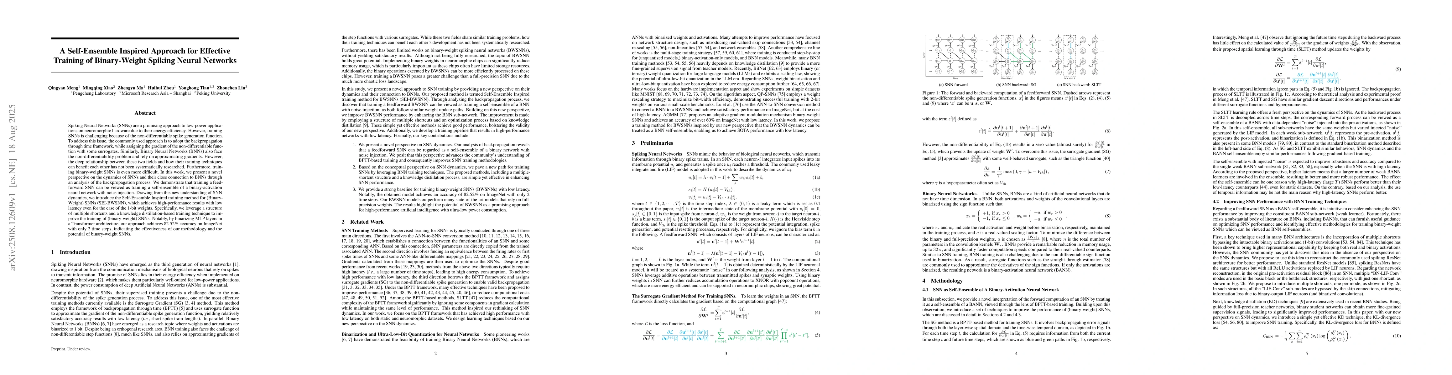 Spiking Neural Networks (SNNs) are a promising approach to low-power applications on neuromorphic hardware due to their energy efficiency. However, training SNNs is challenging because of the non-differentiable spike generation function. To address this issue, the commonly used approach is to adopt the backpropagation through time framework, while assigning the gradient of the non-differentiable function with some surrogates. Similarly, Binary Neural Networks (BNNs) also face the non-differentiability problem and rely on approximating gradients. However, the deep relationship between these two fields and how their training techniques can benefit each other has not been systematically researched. Furthermore, training binary-weight SNNs is even more difficult. In this work, we present a novel perspective on the dynamics of SNNs and their close connection to BNNs through an analysis of the backpropagation process. We demonstrate that training a feedforward SNN can be viewed as training a self-ensemble of a binary-activation neural network with noise injection. Drawing from this new understanding of SNN dynamics, we introduce the Self-Ensemble Inspired training method for (Binary-Weight) SNNs (SEI-BWSNN), which achieves high-performance results with low latency even for the case of the 1-bit weights. Specifically, we leverage a structure of multiple shortcuts and a knowledge distillation-based training technique to improve the training of (binary-weight) SNNs. Notably, by binarizing FFN layers in a Transformer architecture, our approach achieves 82.52% accuracy on ImageNet with only 2 time steps, indicating the effectiveness of our methodology and the potential of binary-weight SNNs.