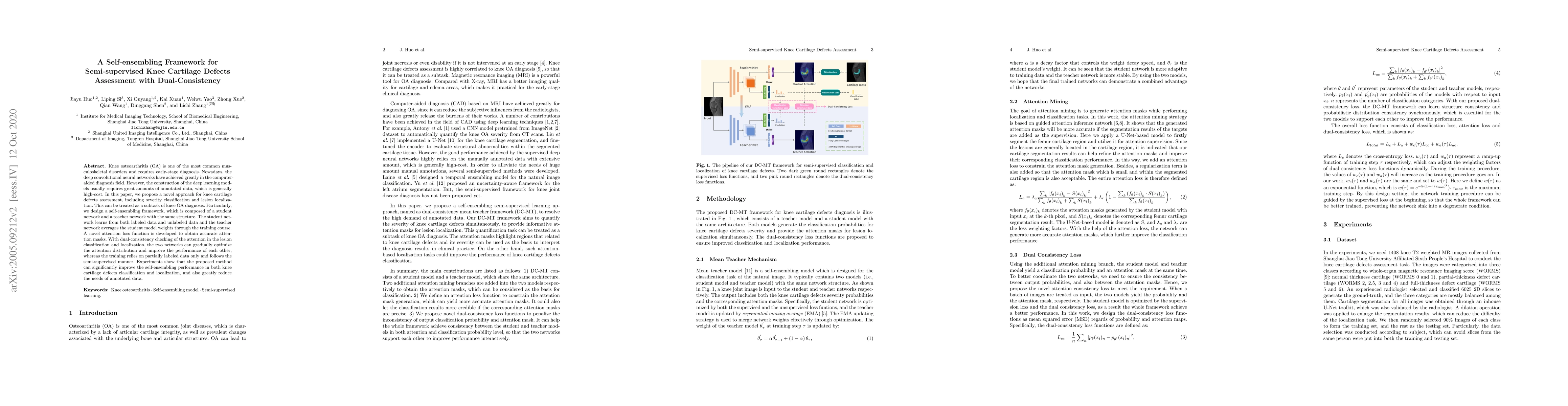 This paper proposes a self-ensembling framework for semi-supervised knee cartilage defect assessment using dual-consistency, which leverages both labeled and unlabeled data to improve classification and localization with minimal annotated data. The framework employs a student network learning from both data types and a teacher network for weight averaging, enhanced by an attention loss function.