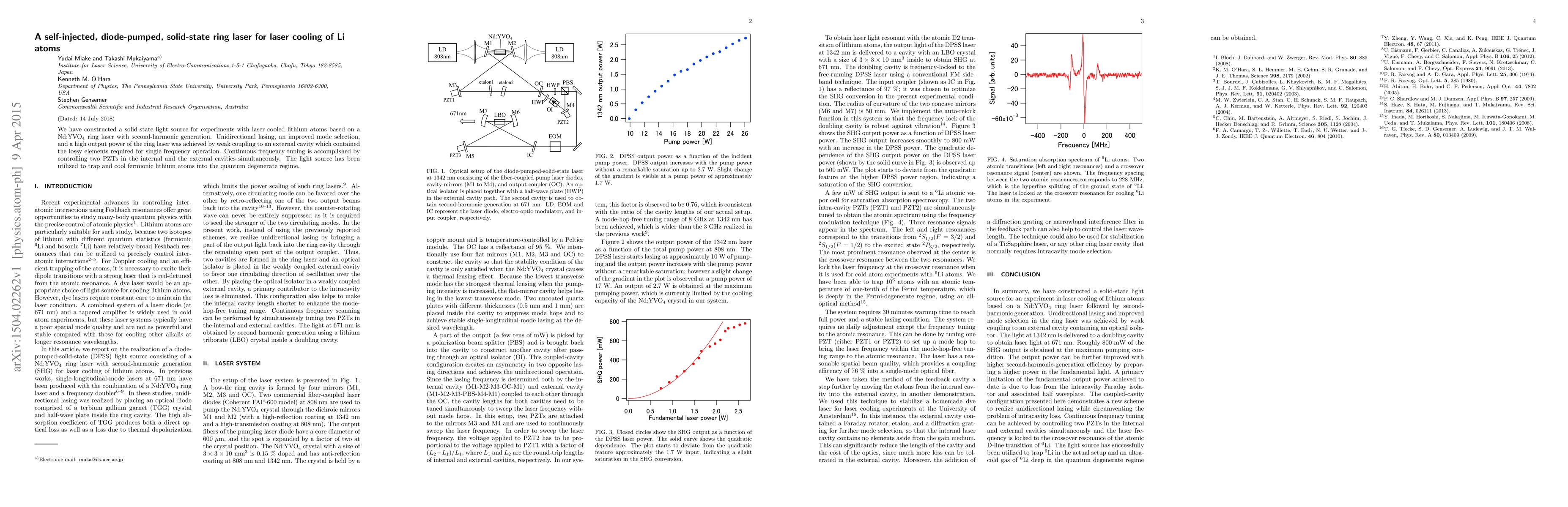 This paper describes the construction of a self-injected, diode-pumped Nd:YVO$_4$ ring laser for laser cooling of Li atoms, utilizing second-harmonic generation and external cavity tuning for high output power and continuous frequency control. The developed light source successfully trapped and cooled fermionic lithium atoms to the quantum degenerate regime.