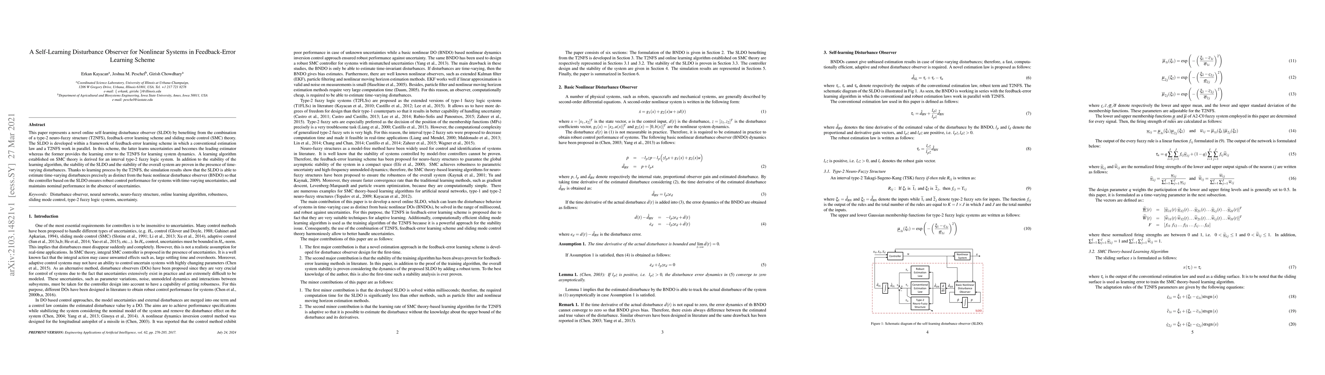 This paper represents a novel online self-learning disturbance observer (SLDO) by benefiting from the combination of a type-2 neuro-fuzzy structure (T2NFS), feedback-error learning scheme and sliding mode control (SMC) theory. The SLDO is developed within a framework of feedback-error learning scheme in which a conventional estimation law and a T2NFS work in parallel. In this scheme, the latter learns uncertainties and becomes the leading estimator whereas the former provides the learning error to the T2NFS for learning system dynamics. A learning algorithm established on SMC theory is derived for an interval type-2 fuzzy logic system. In addition to the stability of the learning algorithm, the stability of the SLDO and the stability of the overall system are proven in the presence of time-varying disturbances. Thanks to learning process by the T2NFS, the simulation results show that the SLDO is able to estimate time-varying disturbances precisely as distinct from the basic nonlinear disturbance observer (BNDO) so that the controller based on the SLDO ensures robust control performance for systems with time-varying uncertainties, and maintains nominal performance in the absence of uncertainties.