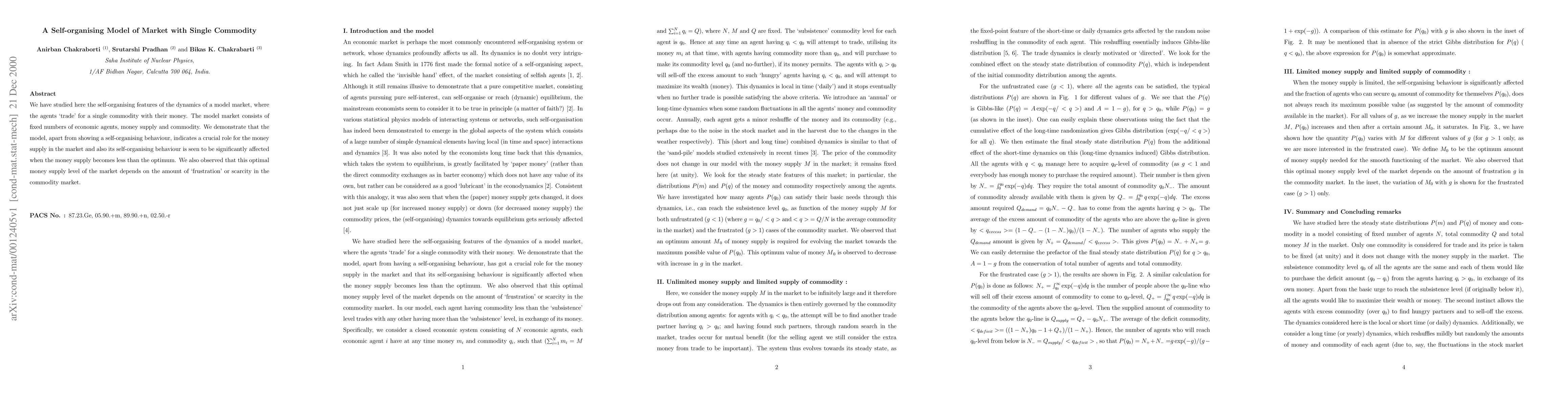 We have studied here the self-organising features of the dynamics of a model market, where the agents `trade' for a single commodity with their money. The model market consists of fixed numbers of economic agents, money supply and commodity. We demonstrate that the model, apart from showing a self-organising behaviour, indicates a crucial role for the money supply in the market and also its self-organising behaviour is seen to be significantly affected when the money supply becomes less than the optimum. We also observed that this optimal money supply level of the market depends on the amount of `frustration' or scarcity in the commodity market.