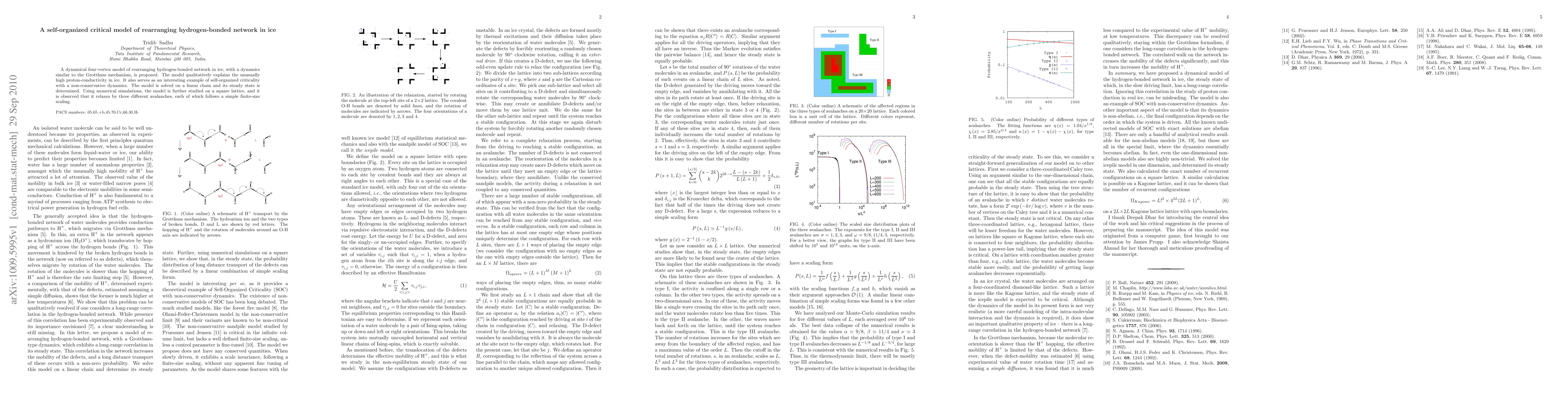 A dynamical four-vertex model of rearranging hydrogen-bonded network in ice, with a dynamics similar to the Grotthuss mechanism, is proposed. The model qualitatively explains the unusually high proton-conductivity in ice. It also serves as an interesting example of self-organized criticality with a non-conservative dynamics. The model is solved on a linear chain and its steady state is determined. Using numerical simulations, the model is further studied on a square lattice, and it is observed that it relaxes by three different avalanches, each of which follows a simple finite-size scaling.