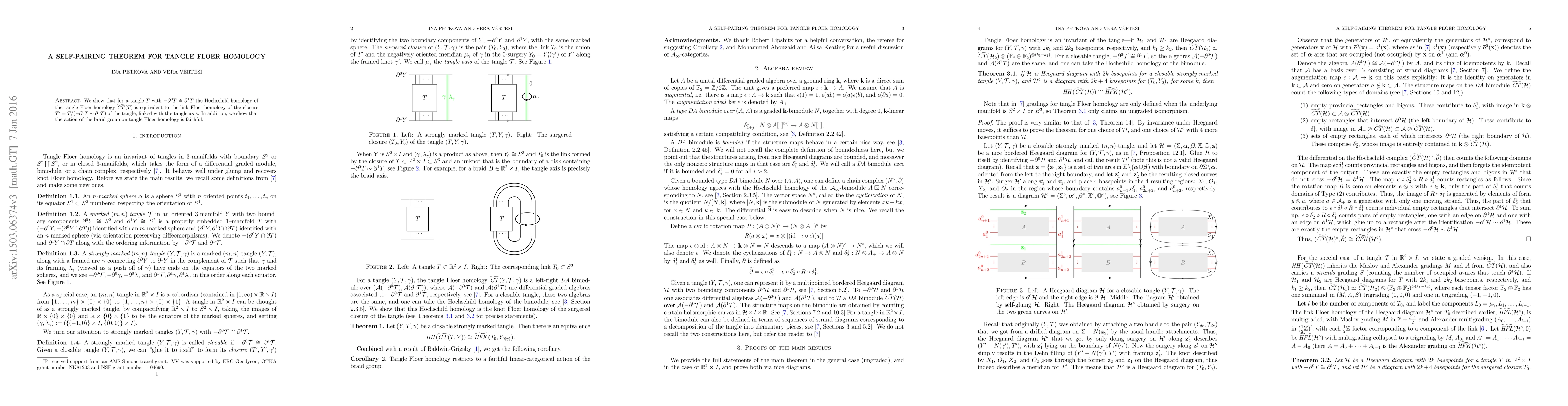 This paper establishes a self-pairing theorem for tangle Floer homology, demonstrating an equivalence between the Hochschild homology of tangle Floer homology and the link Floer homology of the tangle's closure. It also proves that the braid group's action on tangle Floer homology is faithful.