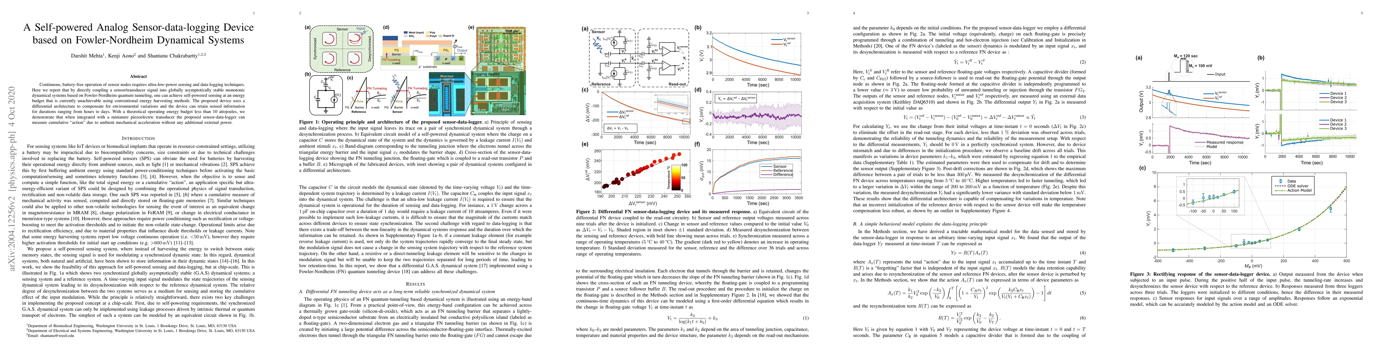 This paper presents a self-powered sensor-data-logging device based on Fowler-Nordheim quantum tunneling, achieving continuous, battery-free operation with ultra-low power. The device uses a differential architecture to maintain accuracy and can retain data for extended periods, operating at an energy budget of less than 10 attojoules.