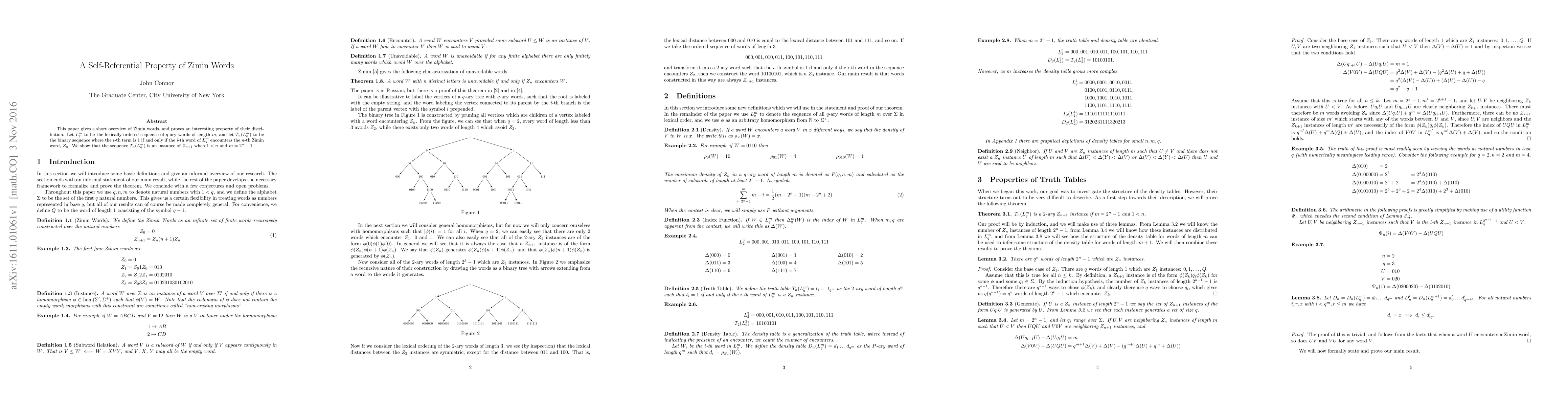 This paper gives a short overview of Zimin words, and proves an interesting property of their distribution. Let $L_q^m$ to be the lexically ordered sequence of $q$-ary words of length $m$, and let $T_n(L_q^m)$ to be the binary sequence where the $i$-th term is $1$ if and only if the $i$-th word of $L_q^m$ encounters the $n$-th Zimin word, $Z_n$. We show that the sequence $T_n(L_q^m)$ is an instance of $Z_{n+1}$ when $1 < n$ and $m=2^n-1$.