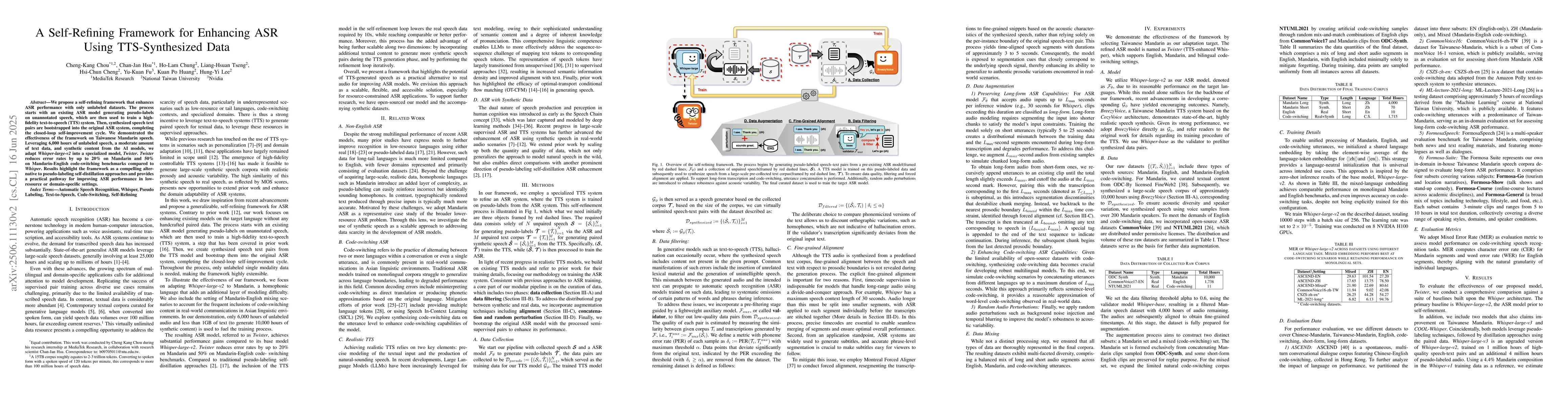 We propose a self-refining framework that enhances ASR performance with only unlabeled datasets. The process starts with an existing ASR model generating pseudo-labels on unannotated speech, which are then used to train a high-fidelity text-to-speech (TTS) system. Then, synthesized speech text pairs are bootstrapped into the original ASR system, completing the closed-loop self-improvement cycle. We demonstrated the effectiveness of the framework on Taiwanese Mandarin speech. Leveraging 6,000 hours of unlabeled speech, a moderate amount of text data, and synthetic content from the AI models, we adapt Whisper-large-v2 into a specialized model, Twister. Twister reduces error rates by up to 20% on Mandarin and 50% on Mandarin-English code-switching benchmarks compared to Whisper. Results highlight the framework as a compelling alternative to pseudo-labeling self-distillation approaches and provides a practical pathway for improving ASR performance in low-resource or domain-specific settings.