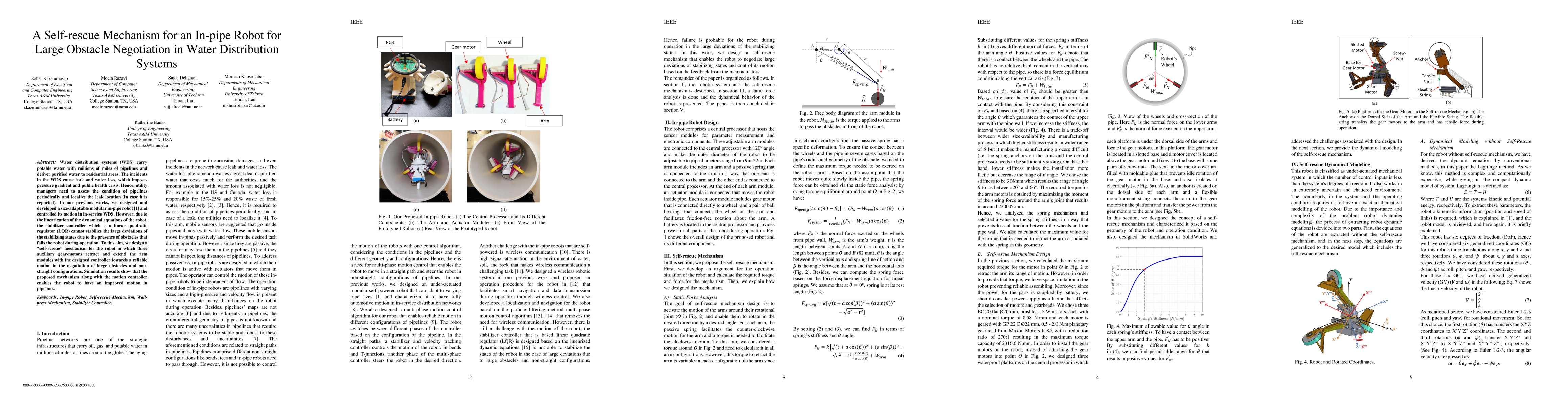 This paper presents a self-rescue mechanism for an in-pipe robot designed to navigate large obstacles in water distribution systems. The mechanism uses auxiliary gear-motors to extend and retract arm modules, enabling the robot to negotiate non-straight configurations and large deviations, improving its operational stability.
