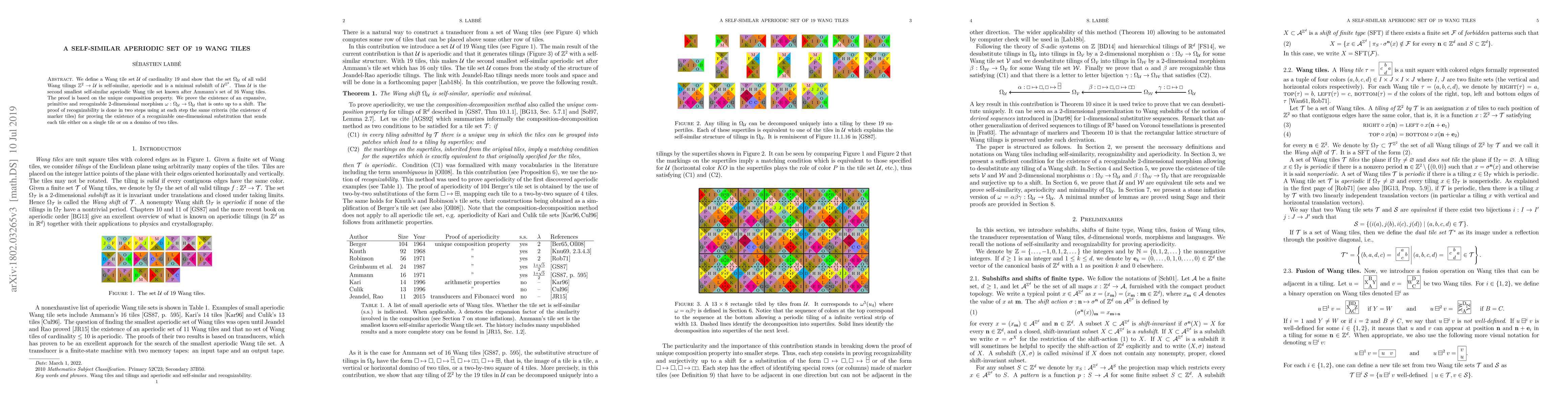 This paper introduces a self-similar aperiodic set of 19 Wang tiles, demonstrating that the set of all valid tilings is a minimal subshift. The proof relies on a unique composition property and an expansive, primitive morphism, making it the second smallest self-similar aperiodic Wang tile set after Ammann's set of 16 tiles.