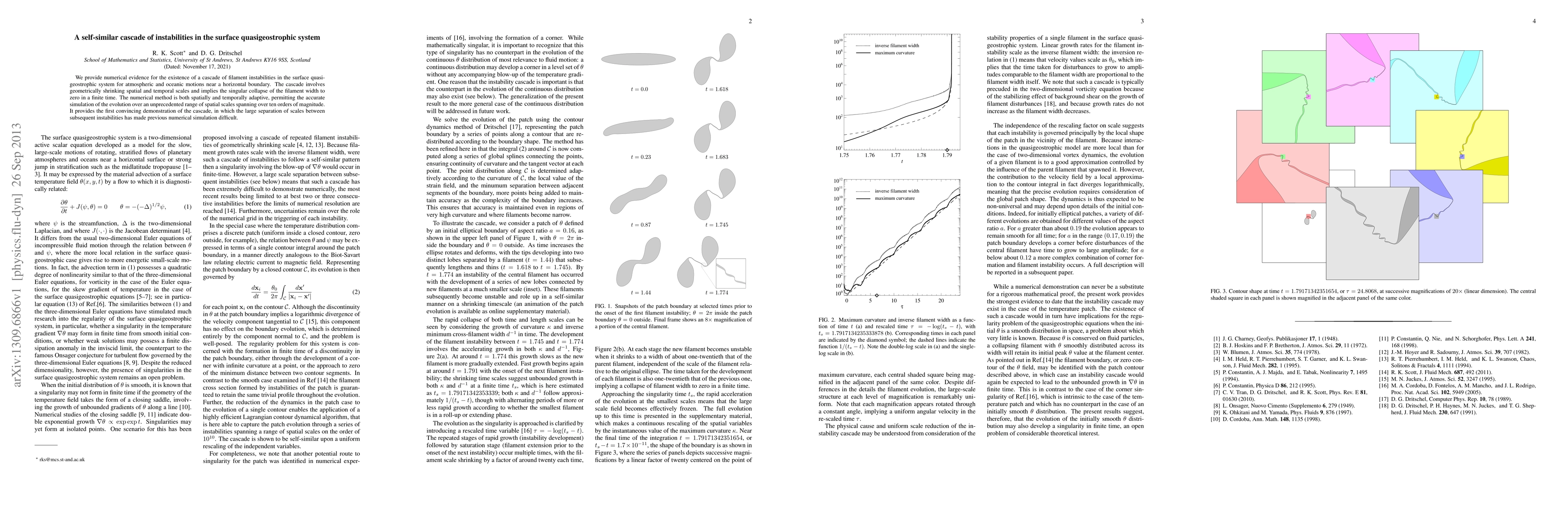 Researchers found a self-similar cascade of instabilities in atmospheric and oceanic motions near a boundary, with geometrically shrinking scales that collapse to zero in a finite time. The study uses an adaptive numerical method to simulate the evolution over vast ranges of spatial scales, providing new insights into these complex phenomena.