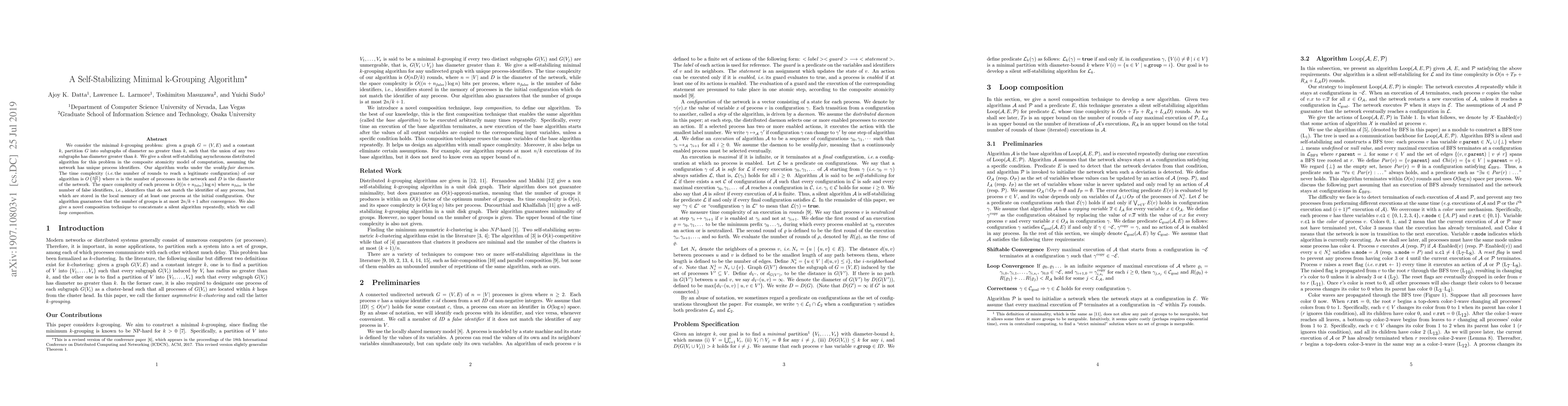 We consider the minimal k-grouping problem: given a graph G=(V,E) and a constant k, partition G into subgraphs of diameter no greater than k, such that the union of any two subgraphs has diameter greater than k. We give a silent self-stabilizing asynchronous distributed algorithm for this problem in the composite atomicity model of computation, assuming the network has unique process identifiers. Our algorithm works under the weakly-fair daemon. The time complexity (i.e., the number of rounds to reach a legitimate configuration) of our algorithm is O(nD/k) where n is the number of processes in the network and \diam is the diameter of the network. The space complexity of each process is O((n +n_{false})log n) where n_{false} is the number of false identifiers, i.e., identifiers that do not match the identifier of any process, but which are stored in the local memory of at least one process at the initial configuration. Our algorithm guarantees that the number of groups is at most $2n/k+1$ after convergence. We also give a novel composition technique to concatenate a silent algorithm repeatedly, which we call loop composition.