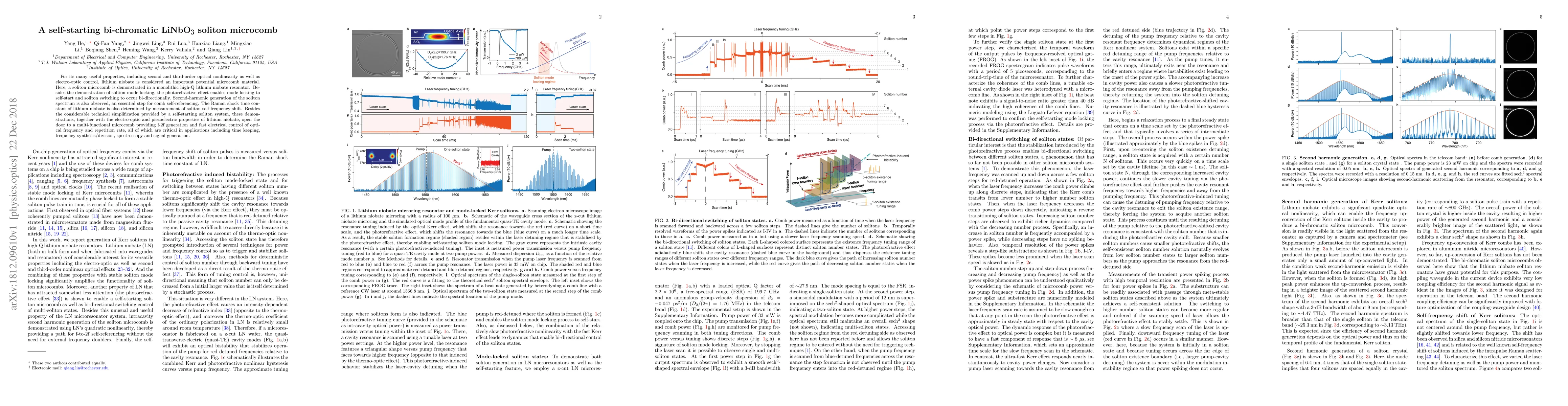 This paper demonstrates a self-starting bi-chromatic soliton microcomb in a lithium niobate resonator, achieving bidirectional soliton switching and second-harmonic generation for self-referencing. The study highlights the material's potential for multifunctional microcombs in applications like timekeeping and signal generation.