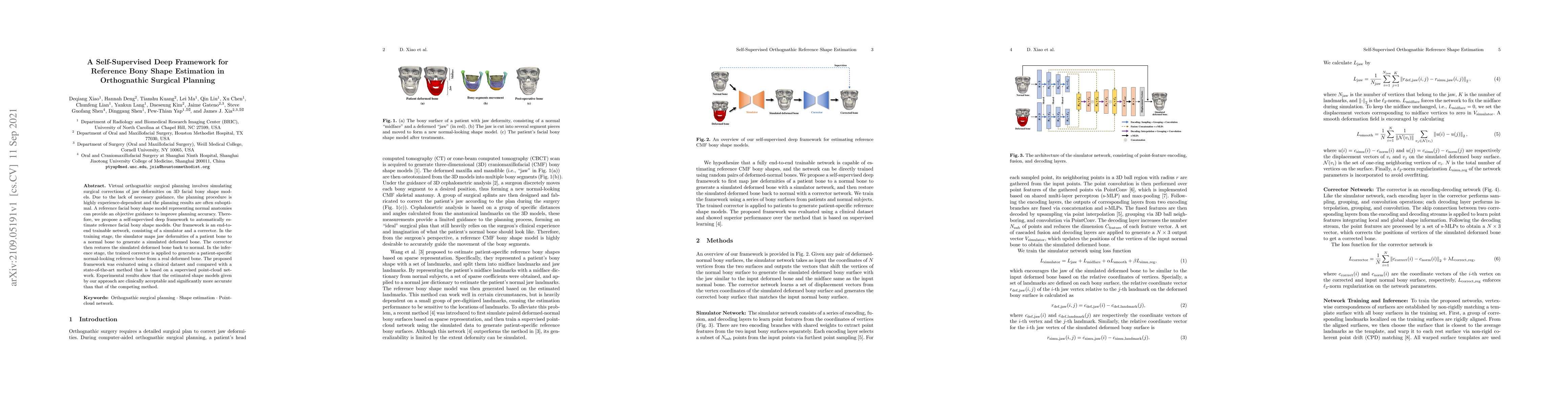 Virtual orthognathic surgical planning involves simulating surgical corrections of jaw deformities on 3D facial bony shape models. Due to the lack of necessary guidance, the planning procedure is highly experience-dependent and the planning results are often suboptimal. A reference facial bony shape model representing normal anatomies can provide an objective guidance to improve planning accuracy. Therefore, we propose a self-supervised deep framework to automatically estimate reference facial bony shape models. Our framework is an end-to-end trainable network, consisting of a simulator and a corrector. In the training stage, the simulator maps jaw deformities of a patient bone to a normal bone to generate a simulated deformed bone. The corrector then restores the simulated deformed bone back to normal. In the inference stage, the trained corrector is applied to generate a patient-specific normal-looking reference bone from a real deformed bone. The proposed framework was evaluated using a clinical dataset and compared with a state-of-the-art method that is based on a supervised point-cloud network. Experimental results show that the estimated shape models given by our approach are clinically acceptable and significantly more accurate than that of the competing method.