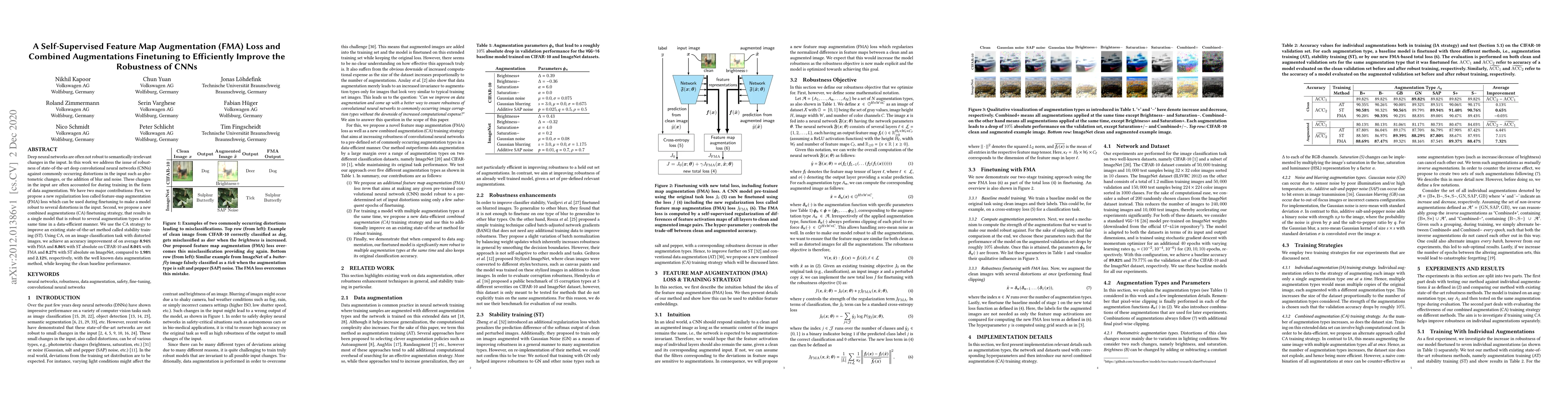 Deep neural networks are often not robust to semantically-irrelevant changes in the input. In this work we address the issue of robustness of state-of-the-art deep convolutional neural networks (CNNs) against commonly occurring distortions in the input such as photometric changes, or the addition of blur and noise. These changes in the input are often accounted for during training in the form of data augmentation. We have two major contributions: First, we propose a new regularization loss called feature-map augmentation (FMA) loss which can be used during finetuning to make a model robust to several distortions in the input. Second, we propose a new combined augmentations (CA) finetuning strategy, that results in a single model that is robust to several augmentation types at the same time in a data-efficient manner. We use the CA strategy to improve an existing state-of-the-art method called stability training (ST). Using CA, on an image classification task with distorted images, we achieve an accuracy improvement of on average 8.94% with FMA and 8.86% with ST absolute on CIFAR-10 and 8.04% with FMA and 8.27% with ST absolute on ImageNet, compared to 1.98% and 2.12%, respectively, with the well known data augmentation method, while keeping the clean baseline performance.