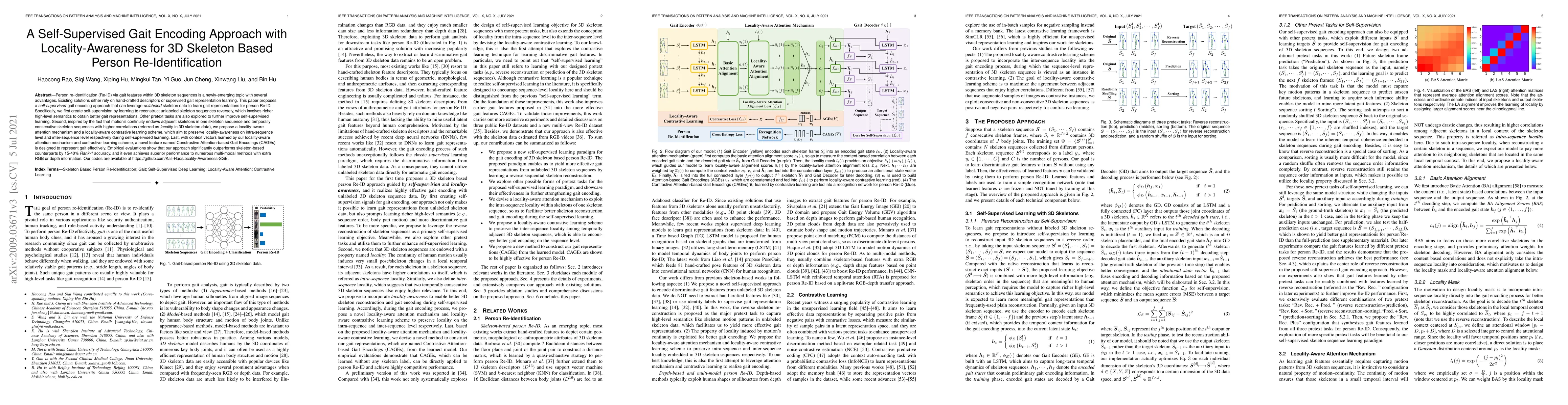 This paper proposes a self-supervised gait encoding approach leveraging unlabeled 3D skeleton data for person re-identification, incorporating a locality-aware attention mechanism and contrastive learning to preserve spatial and temporal correlations. The method achieves significant improvements over existing methods, demonstrating superior Rank-1 accuracy by 15-40%.