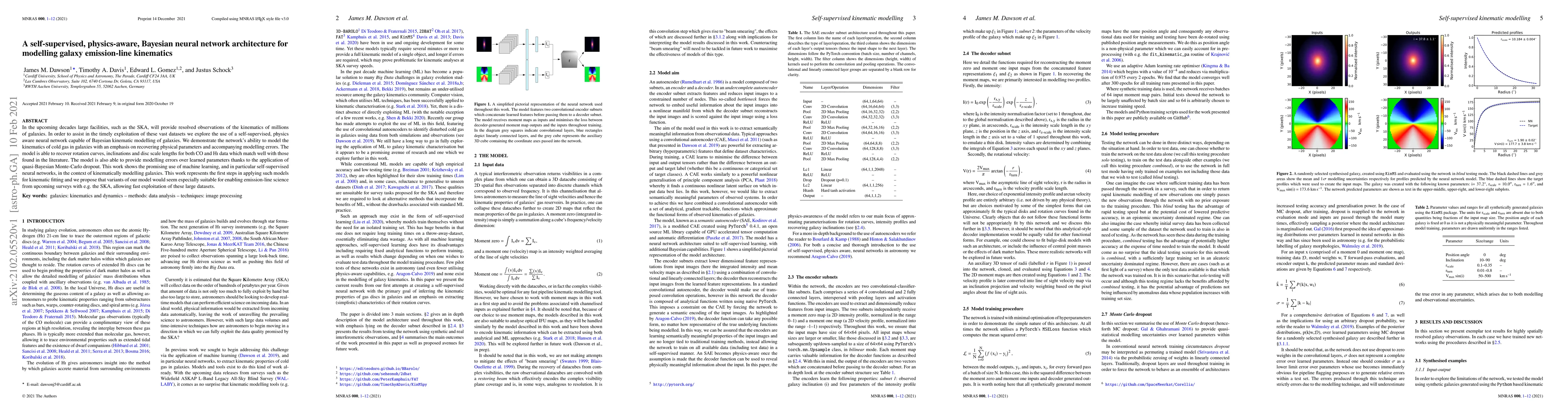 In the upcoming decades large facilities, such as the SKA, will provide resolved observations of the kinematics of millions of galaxies. In order to assist in the timely exploitation of these vast datasets we explore the use of a self-supervised, physics aware neural network capable of Bayesian kinematic modelling of galaxies. We demonstrate the network's ability to model the kinematics of cold gas in galaxies with an emphasis on recovering physical parameters and accompanying modelling errors. The model is able to recover rotation curves, inclinations and disc scale lengths for both CO and HI data which match well with those found in the literature. The model is also able to provide modelling errors over learned parameters thanks to the application of quasi-Bayesian Monte-Carlo dropout. This work shows the promising use of machine learning, and in particular self-supervised neural networks, in the context of kinematically modelling galaxies. This work represents the first steps in applying such models for kinematic fitting and we propose that variants of our model would seem especially suitable for enabling emission-line science from upcoming surveys with e.g. the SKA, allowing fast exploitation of these large datasets.