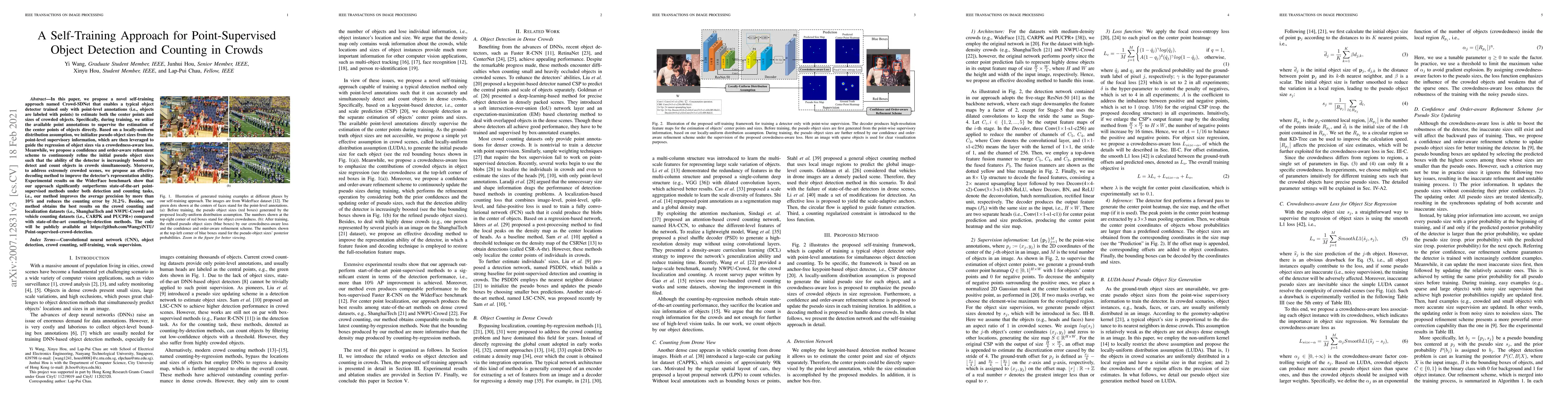 A self-training approach called Crowd-SDNet improves object detection and counting in crowded scenes by learning to estimate center points and sizes from point-level annotations, outperforming state-of-the-art methods with significant gains in average precision and error reduction.