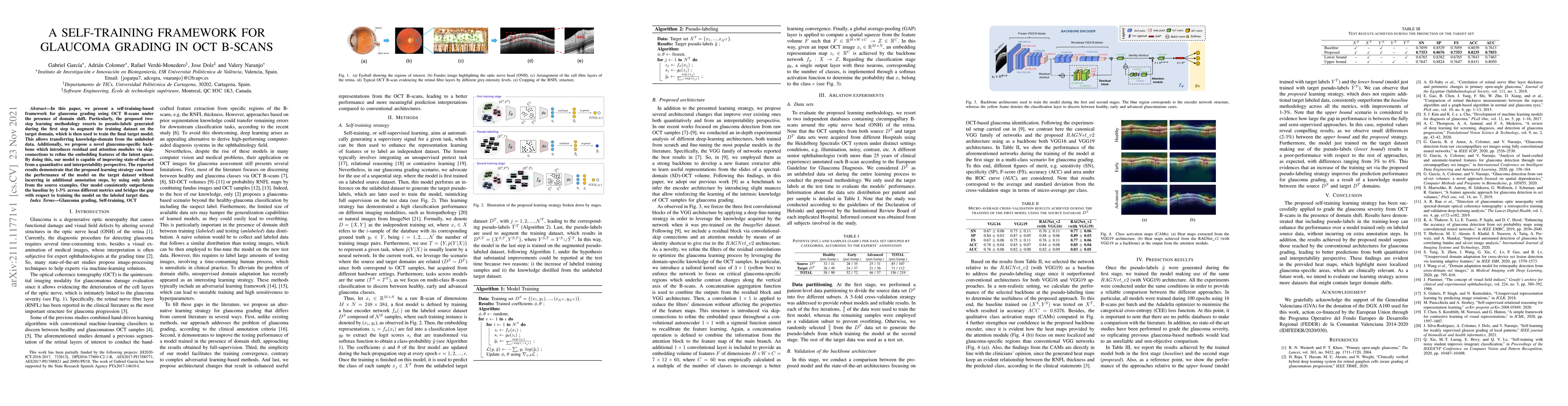 In this paper, we present a self-training-based framework for glaucoma grading using OCT B-scans under the presence of domain shift. Particularly, the proposed two-step learning methodology resorts to pseudo-labels generated during the first step to augment the training dataset on the target domain, which is then used to train the final target model. This allows transferring knowledge-domain from the unlabeled data. Additionally, we propose a novel glaucoma-specific backbone which introduces residual and attention modules via skip-connections to refine the embedding features of the latent space. By doing this, our model is capable of improving state-of-the-art from a quantitative and interpretability perspective. The reported results demonstrate that the proposed learning strategy can boost the performance of the model on the target dataset without incurring in additional annotation steps, by using only labels from the source examples. Our model consistently outperforms the baseline by 1-3% across different metrics and bridges the gap with respect to training the model on the labeled target data.