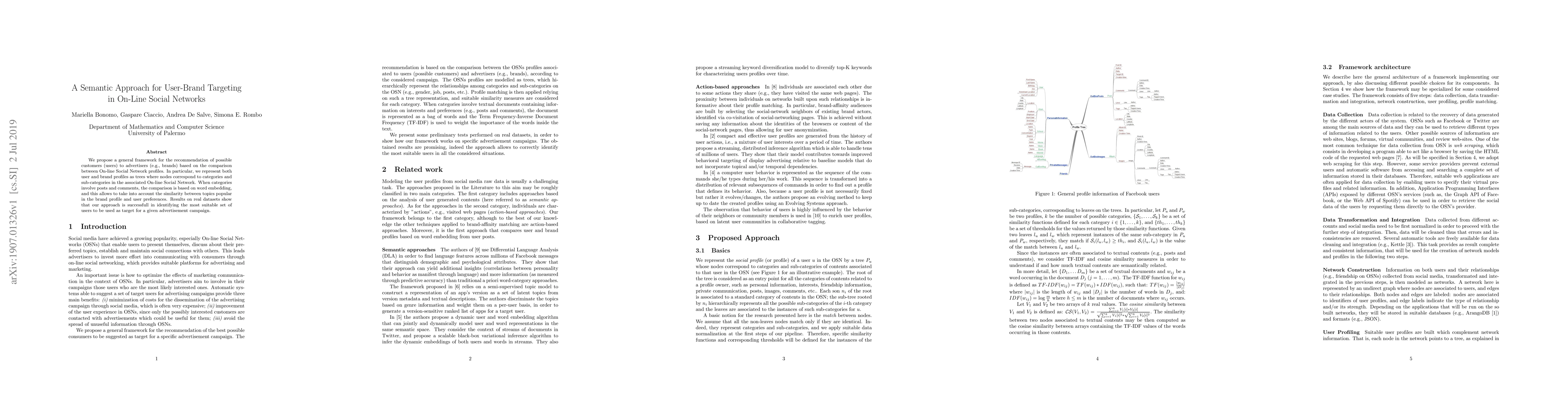 We propose a general framework for the recommendation of possible customers (users) to advertisers (e.g., brands) based on the comparison between On-line Social Network profiles. In particular, we represent both user and brand profiles as trees where nodes correspond to categories and sub-categories in the associated On-line Social Network. When categories involve posts and comments, the comparison is based on word embedding, and this allows to take into account the similarity between topics popular in the brand profile and user preferences. Results on real datasets show that our approach is successfull in identifying the most suitable set of users to be used as target for a given advertisement campaign.