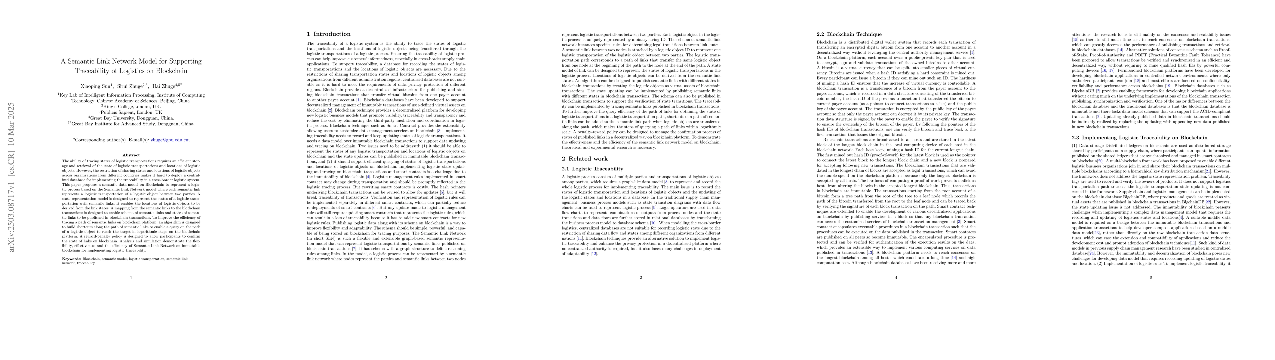 The paper presents a novel Semantic Link Network model for logistics traceability on blockchain, incorporating state representation, location inference, efficient path tracing algorithms, and a reward-penalty policy for consistent link state confirmation.