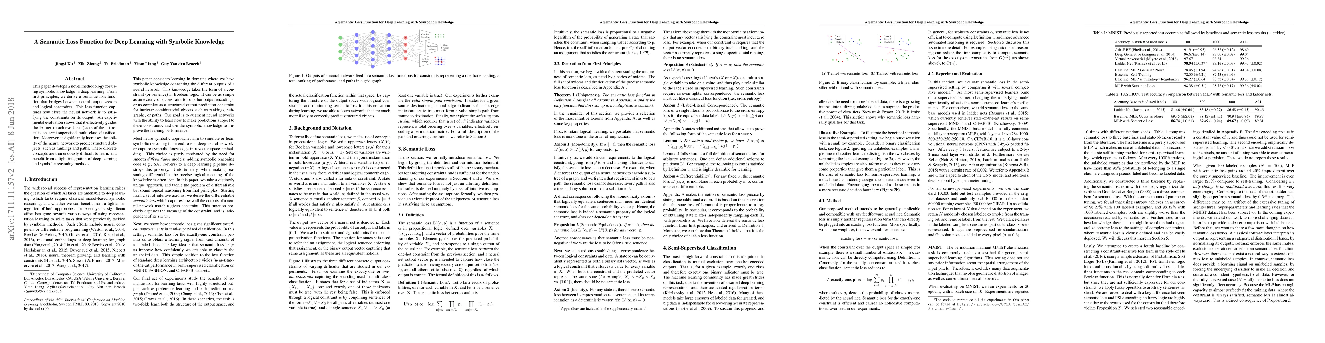 This paper introduces a semantic loss function that integrates symbolic knowledge to guide deep learning, achieving near-state-of-the-art results in semi-supervised multi-class classification and enhancing the network's ability to predict structured objects like rankings and paths.