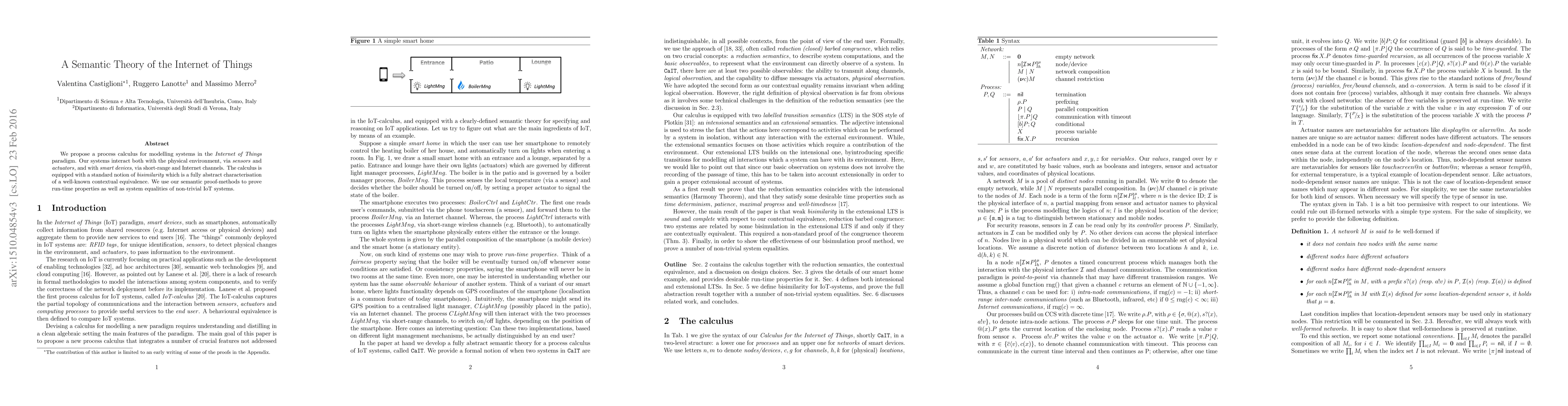 We propose a process calculus for modelling systems in the Internet of Things paradigm. Our systems interact both with the physical environment, via sensors and actuators, and with smart devices, via short-range and Internet channels. The calculus is equipped with a standard notion of bisimilarity which is a fully abstract characterisation of a well-known contextual equivalence. We use our semantic proof-methods to prove run-time properties as well as system equalities of non-trivial IoT systems.