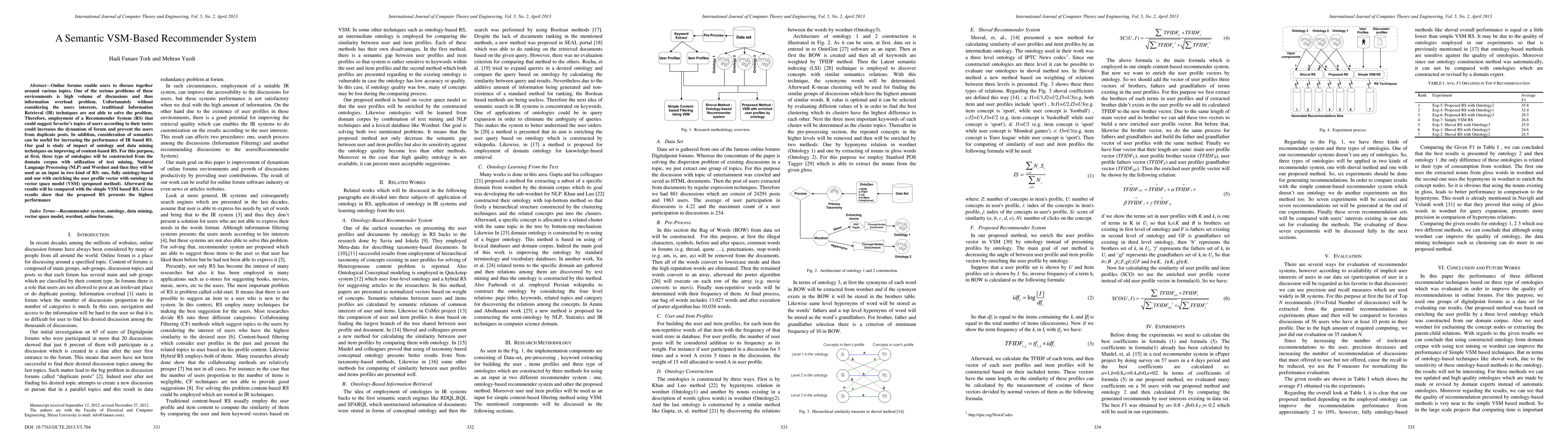 Online forums enable users to discuss together around various topics. One of the serious problems of these environments is high volume of discussions and thus information overload problem. Unfortunately without considering the users interests, traditional Information Retrieval (IR) techniques are not able to solve the problem. Therefore, employment of a Recommender System (RS) that could suggest favorite's topics of users according to their tastes could increases the dynamism of forum and prevent the users from duplicate posts. In addition, consideration of semantics can be useful for increasing the performance of IR based RS. Our goal is study of impact of ontology and data mining techniques on improving of content-based RS. For this purpose, at first, three type of ontologies will be constructed from the domain corpus with utilization of text mining, Natural Language Processing (NLP) and Wordnet and then they will be used as an input in two kind of RS: one, fully ontology-based and one with enriching the user profile vector with ontology in vector space model (VSM) (proposed method). Afterward the results will be compared with the simple VSM based RS. Given results show that the proposed RS presents the highest performance.