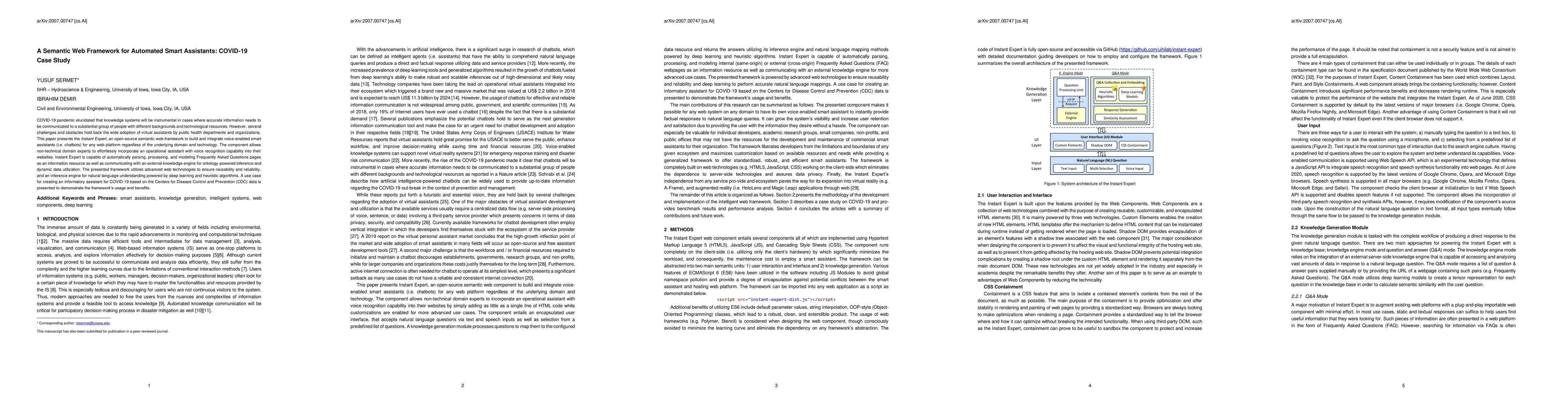 COVID-19 pandemic elucidated that knowledge systems will be instrumental in cases where accurate information needs to be communicated to a substantial group of people with different backgrounds and technological resources. However, several challenges and obstacles hold back the wide adoption of virtual assistants by public health departments and organizations. This paper presents the Instant Expert, an open-source semantic web framework to build and integrate voice-enabled smart assistants (i.e. chatbots) for any web platform regardless of the underlying domain and technology. The component allows non-technical domain experts to effortlessly incorporate an operational assistant with voice recognition capability into their websites. Instant Expert is capable of automatically parsing, processing, and modeling Frequently Asked Questions pages as an information resource as well as communicating with an external knowledge engine for ontology-powered inference and dynamic data utilization. The presented framework utilizes advanced web technologies to ensure reusability and reliability, and an inference engine for natural language understanding powered by deep learning and heuristic algorithms. A use case for creating an informatory assistant for COVID-19 based on the Centers for Disease Control and Prevention (CDC) data is presented to demonstrate the framework's usage and benefits.