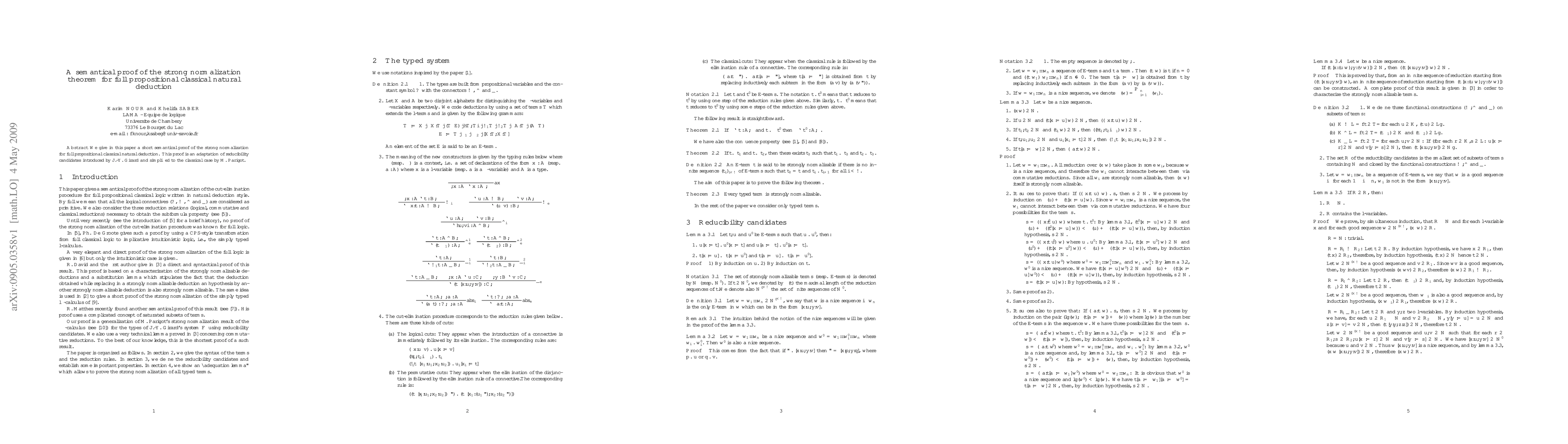 Summary: This paper presents a concise semantical proof of the strong normalization theorem for full propositional classical natural deduction, adapted from the reducibility candidates developed by Girard and simplified for classical logic by Parigot.
