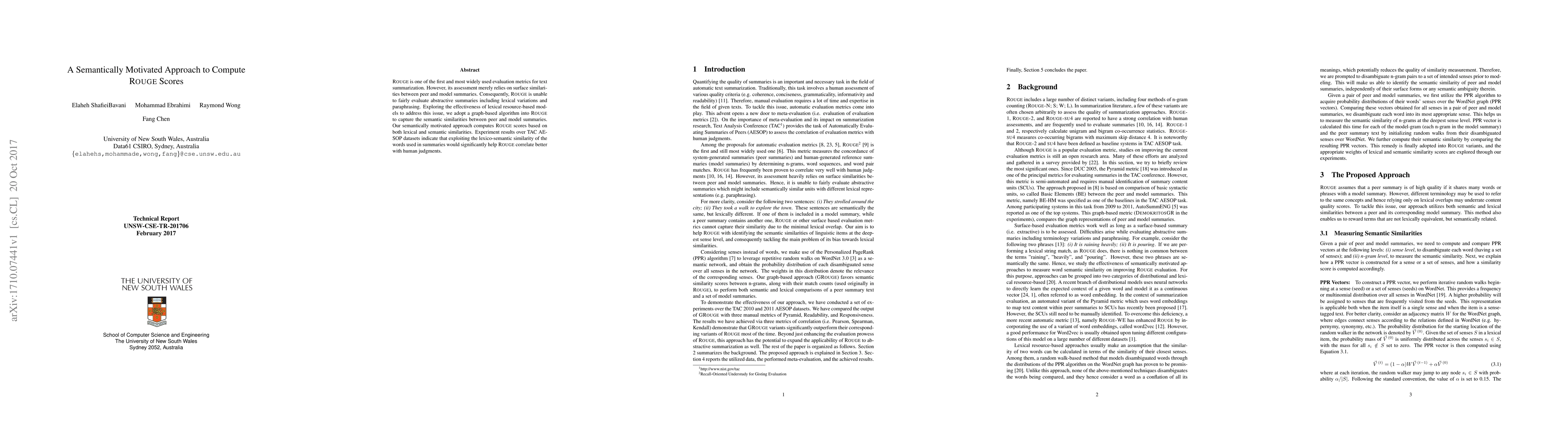 A new approach to ROUGE scores is proposed that combines lexical and semantic similarities between peer and model summaries to improve evaluation of abstractive summaries.