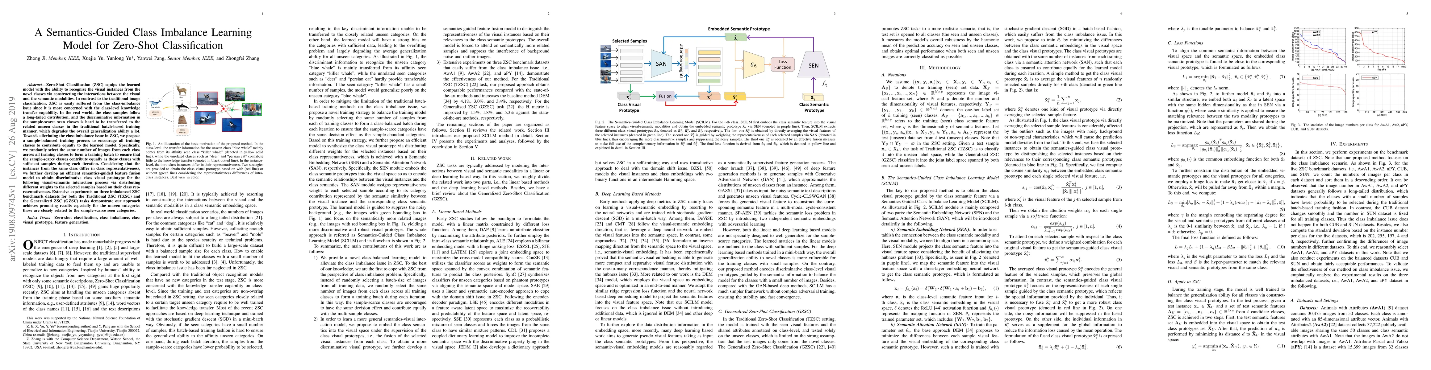 Zero-Shot Classification (ZSC) equips the learned model with the ability to recognize the visual instances from the novel classes via constructing the interactions between the visual and the semantic modalities. In contrast to the traditional image classification, ZSC is easily suffered from the class-imbalance issue since it is more concerned with the class-level knowledge transfer capability. In the real world, the class samples follow a long-tailed distribution, and the discriminative information in the sample-scarce seen classes is hard to be transferred to the related unseen classes in the traditional batch-based training manner, which degrades the overall generalization ability a lot. Towards alleviating the class imbalance issue in ZSC, we propose a sample-balanced training process to encourage all training classes to contribute equally to the learned model. Specifically, we randomly select the same number of images from each class across all training classes to form a training batch to ensure that the sample-scarce classes contribute equally as those classes with sufficient samples during each iteration. Considering that the instances from the same class differ in class representativeness, we further develop an efficient semantics-guided feature fusion model to obtain discriminative class visual prototype for the following visual-semantic interaction process via distributing different weights to the selected samples based on their class representativeness. Extensive experiments on three imbalanced ZSC benchmark datasets for both the Traditional ZSC (TZSC) and the Generalized ZSC (GZSC) tasks demonstrate our approach achieves promising results especially for the unseen categories those are closely related to the sample-scarce seen categories.