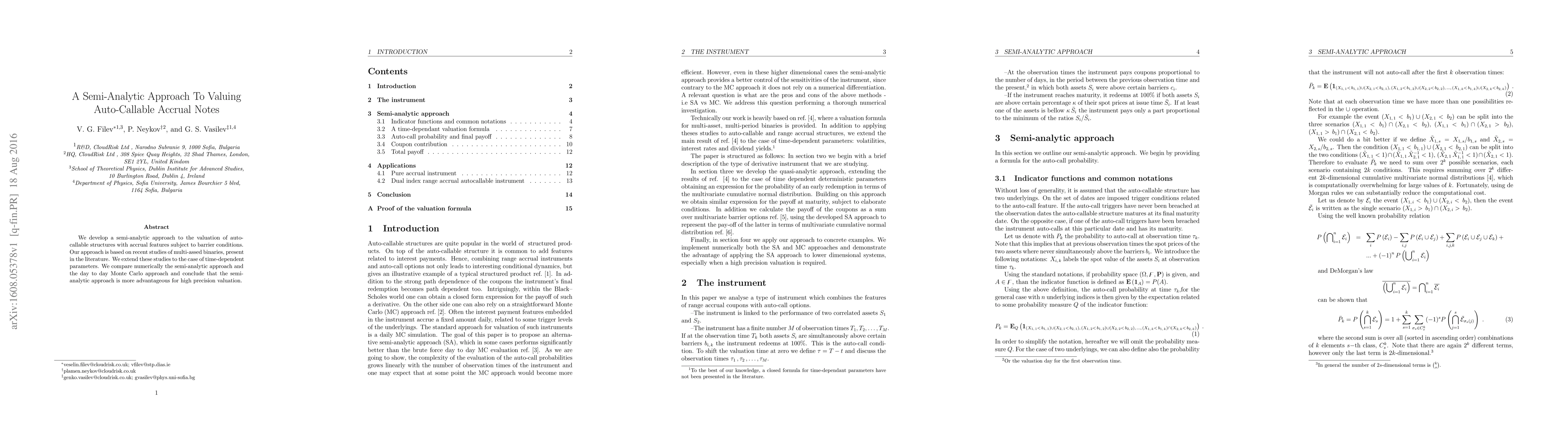 We develop a semi-analytic approach to the valuation of auto-callable structures with accrual features subject to barrier conditions. Our approach is based on recent studies of multi-assed binaries, present in the literature. We extend these studies to the case of time-dependent parameters. We compare numerically the semi-analytic approach and the day to day Monte Carlo approach and conclude that the semi-analytic approach is more advantageous for high precision valuation.