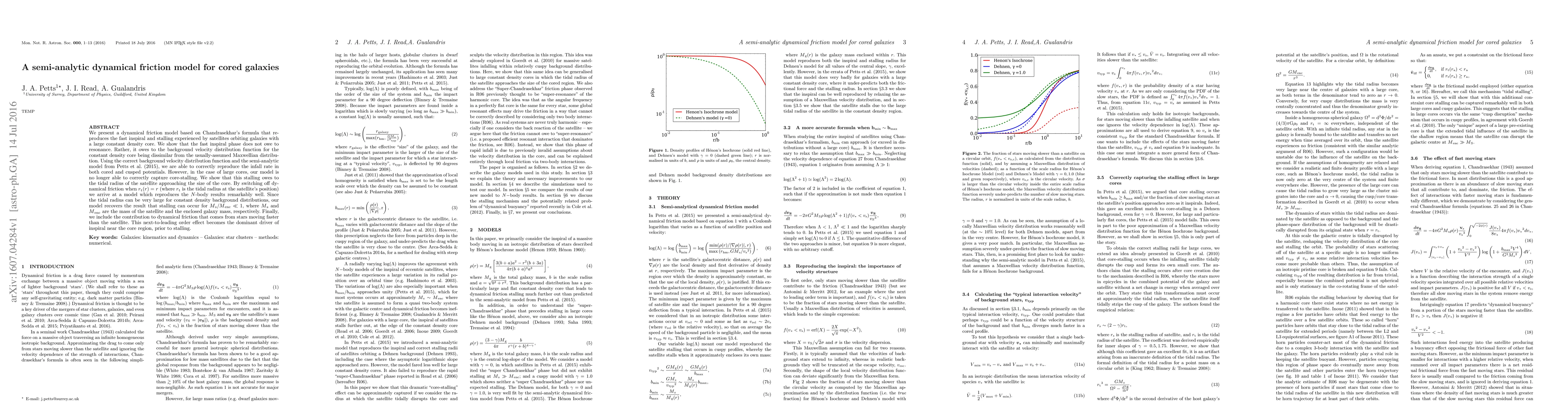 This paper develops a semi-analytic dynamical friction model for satellites orbiting galaxies with constant density cores, showing that the fast inspiral phase results from a non-Maxwellian background velocity distribution. The model accurately reproduces infall rates but requires switching off dynamical friction when the satellite's tidal radius equals the core size to capture core-stalling.