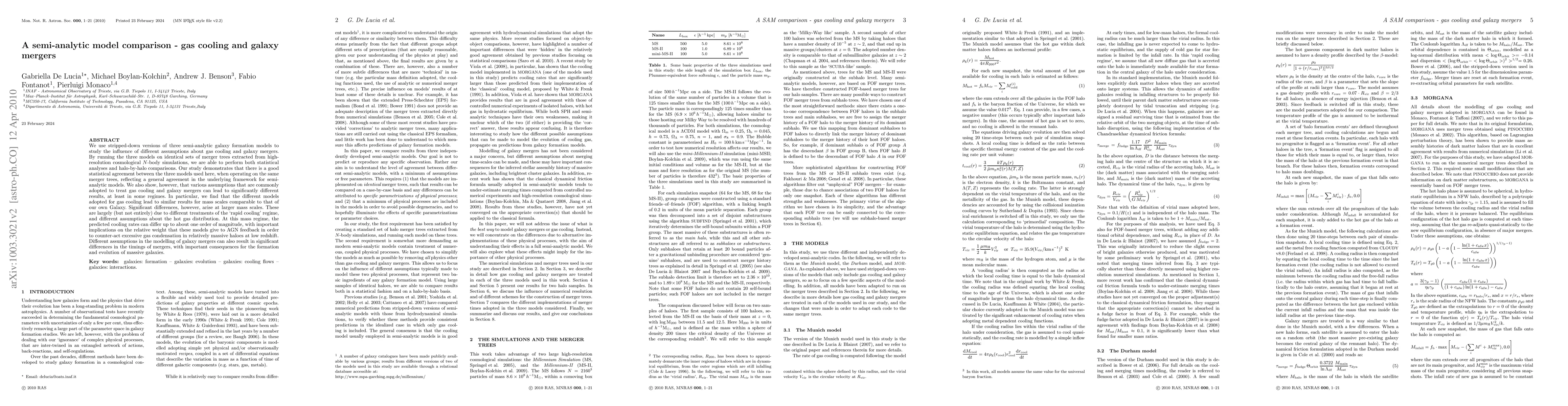This paper compares three semi-analytic galaxy formation models, finding good statistical agreement when applied to the same merger trees but highlighting significant differences in gas cooling and merger assumptions, especially at larger mass scales, impacting predictions of AGN feedback and merger timings.