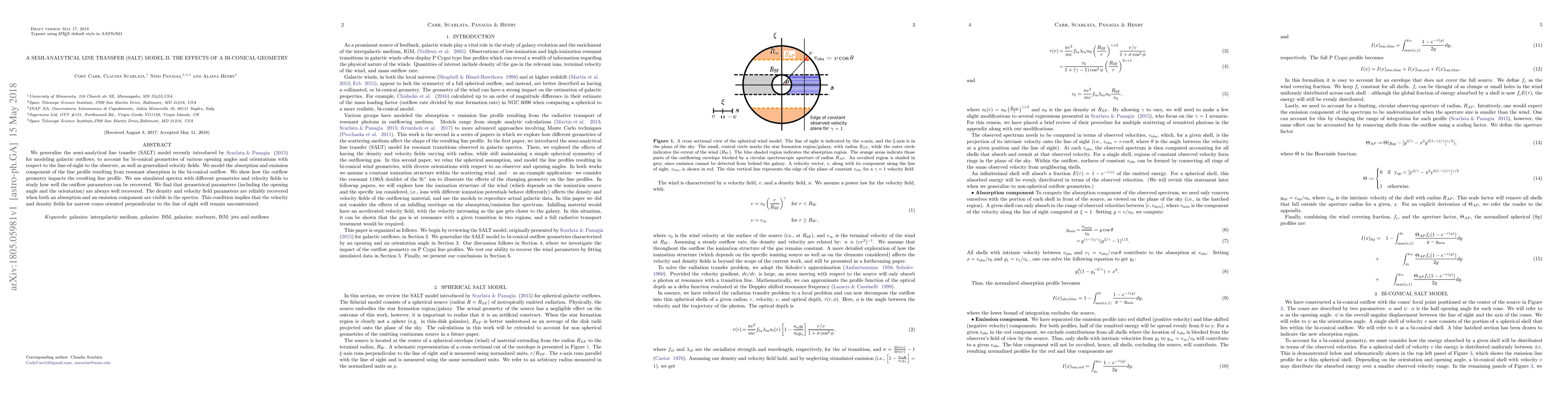 We generalize the semi-analytical line transfer (SALT) model recently introduced by Scarlata \& Panagia (2015) for modeling galactic outflows, to account for bi-conical geometries of various opening angles and orientations with respect to the line-of-sight to the observer, as well as generalized velocity fields. We model the absorption and emission component of the line profile resulting from resonant absorption in the bi-conical outflow. We show how the outflow geometry impacts the resulting line profile. We use simulated spectra with different geometries and velocity fields to study how well the outflow parameters can be recovered. We find that geometrical parameters (including the opening angle and the orientation) are always well recovered. The density and velocity field parameters are reliably recovered when both an absorption and an emission component are visible in the spectra. This condition implies that the velocity and density fields for narrow cones oriented perpendicular to the line of sight will remain unconstrained.