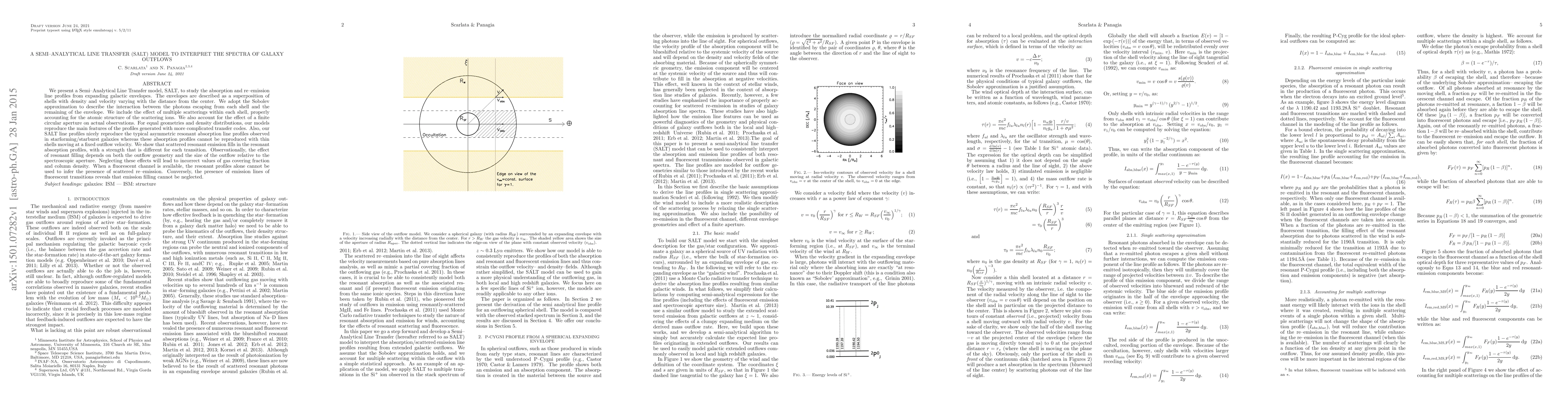 We present a Semi-Analytical Line Transfer model, SALT, to study the absorption and re-emission line profiles from expanding galactic envelopes. The envelopes are described as a superposition of shells with density and velocity varying with the distance from the center. We adopt the Sobolev approximation to describe the interaction between the photons escaping from each shell and the remaining of the envelope. We include the effect of multiple scatterings within each shell, properly accounting for the atomic structure of the scattering ions. We also account for the effect of a finite circular aperture on actual observations. For equal geometries and density distributions, our models reproduce the main features of the profiles generated with more complicated transfer codes. Also, our SALT line profiles nicely reproduce the typical asymmetric resonant absorption line profiles observed in star-forming/starburst galaxies whereas these absorption profiles cannot be reproduced with thin shells moving at a fixed outflow velocity. We show that scattered resonant emission fills in the resonant absorption profiles, with a strength that is different for each transition. Observationally, the effect of resonant filling depends on both the outflow geometry and the size of the outflow relative to the spectroscopic aperture. Neglecting these effects will lead to incorrect values of gas covering fraction and column density. When a fluorescent channel is available, the resonant profiles alone cannot be used to infer the presence of scattered re-emission. Conversely, the presence of emission lines of fluorescent transitions reveals that emission filling cannot be neglected.