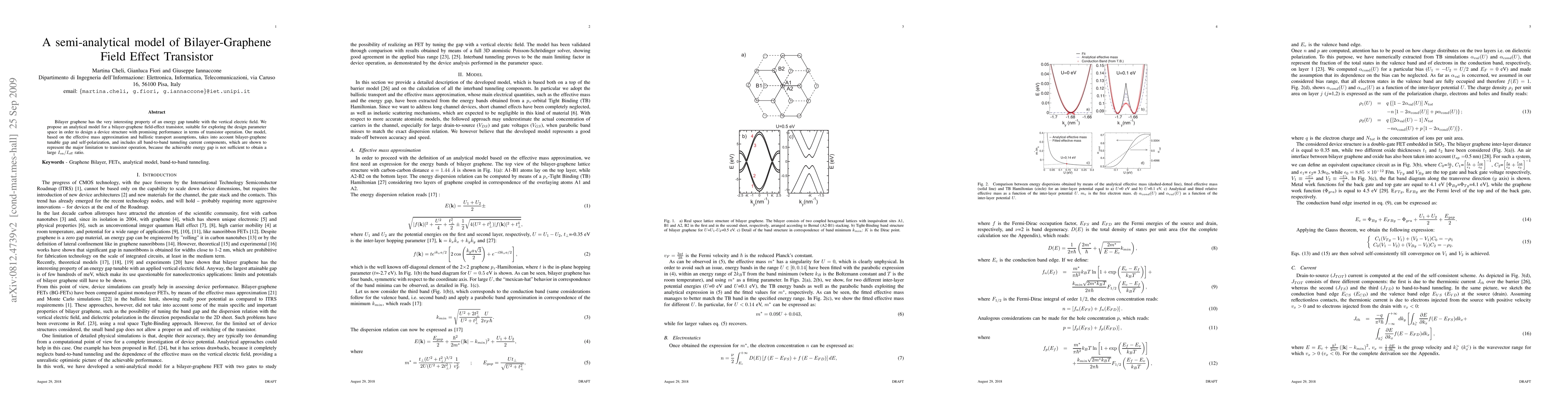 The paper presents a semi-analytical model for a bilayer graphene field-effect transistor, focusing on its tunable energy gap and self-polarization. The model highlights band-to-band tunneling currents as the main limitation to achieving a high Ion/Ioff ratio for transistor operation.