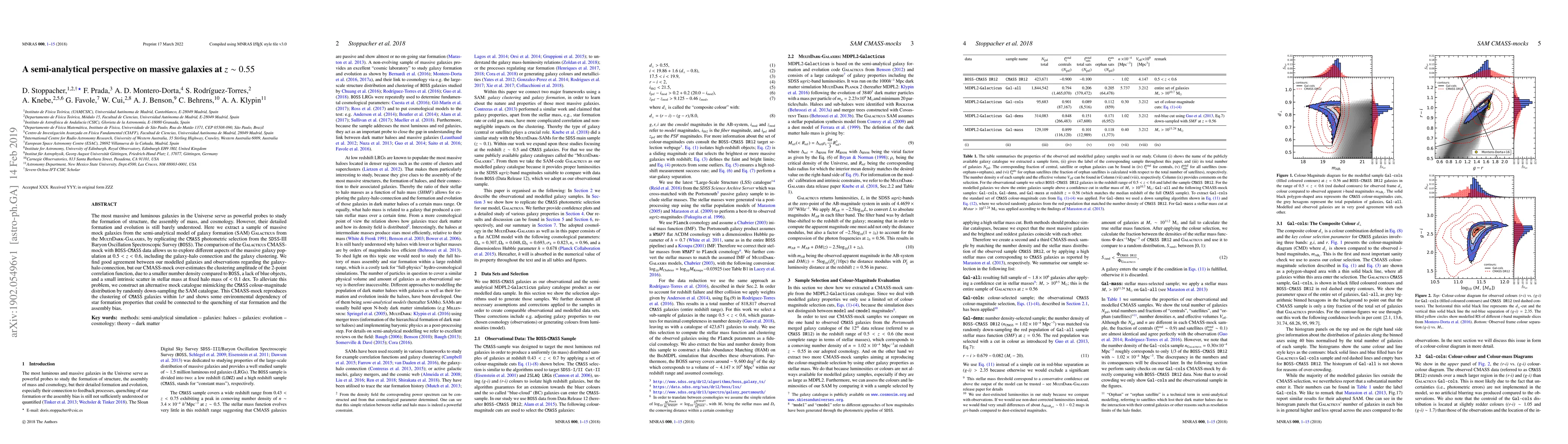 This paper uses a semi-analytical model to simulate massive galaxies at $z\sim0.55$ and compares it to observational data from BOSS. While the galaxy-halo connection is well-modeled, the clustering amplitude is overestimated due to factors like lower density and lack of blue galaxies. An alternative mock catalogue addresses these issues, showing improved clustering and environmental effects on star formation.