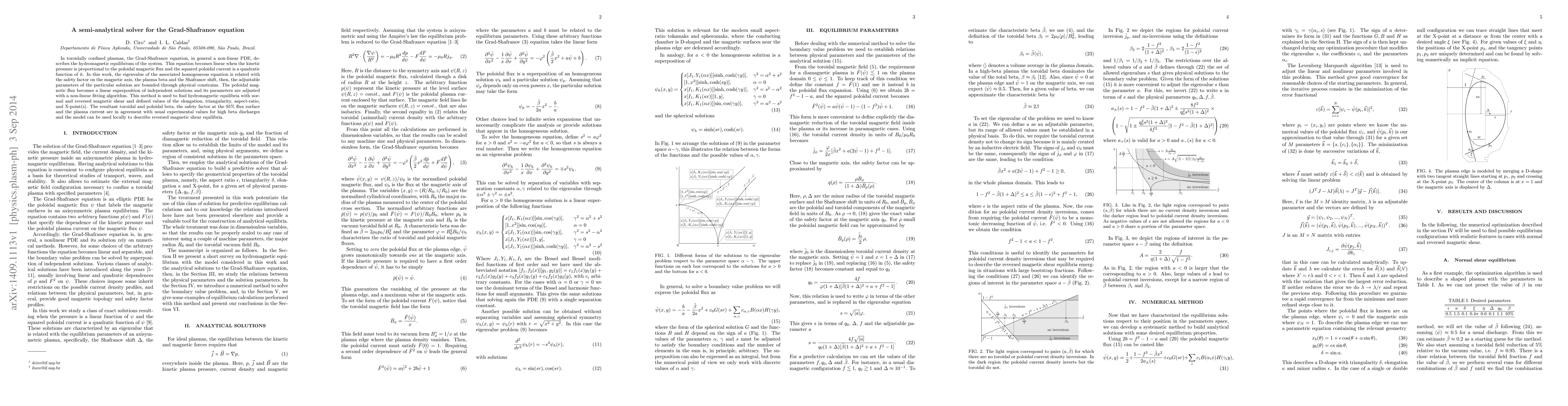 This paper presents a semi-analytical solver for the Grad-Shafranov equation to model hydromagnetic equilibria in toroidal plasmas, relating its eigenvalues to physical parameters and employing a non-linear fitting algorithm to determine the poloidal magnetic flux. The method accurately describes equilibria with various magnetic shears and configurations.