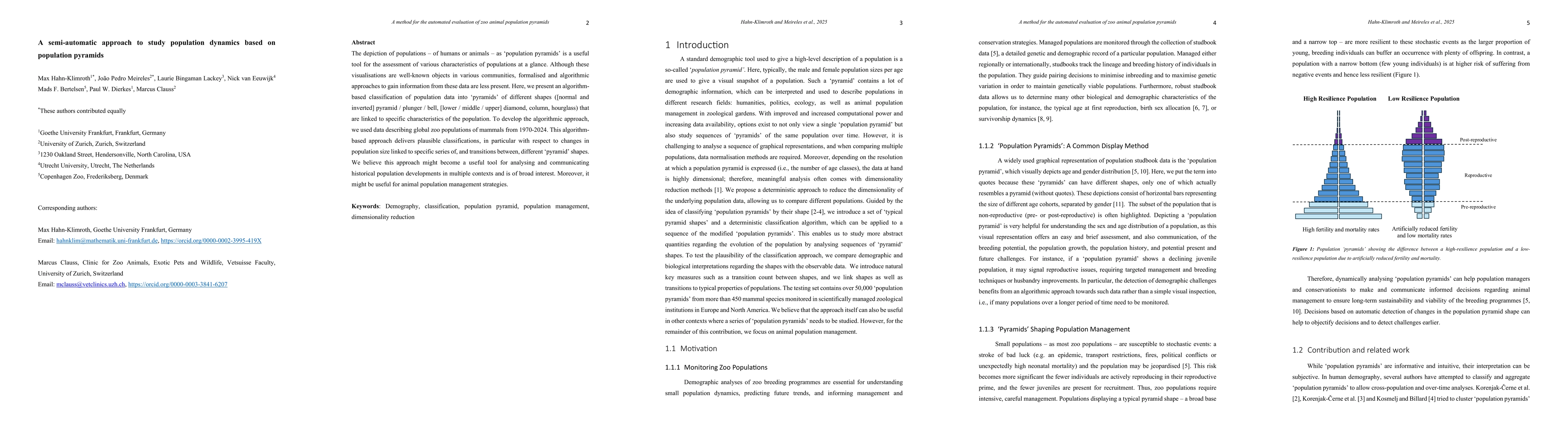 The depiction of populations - of humans or animals - as "population pyramids" is a useful tool for the assessment of various characteristics of populations at a glance. Although these visualisations are well-known objects in various communities, formalised and algorithmic approaches to gain information from these data are less present. Here, we present an algorithm-based classification of population data into "pyramids" of different shapes ([normal and inverted] pyramid / plunger / bell, [lower / middle / upper] diamond, column, hourglass) that are linked to specific characteristics of the population. To develop the algorithmic approach, we used data describing global zoo populations of mammals from 1970-2024. This algorithm-based approach delivers plausible classifications, in particular with respect to changes in population size linked to specific series of, and transitions between, different "pyramid" shapes. We believe this approach might become a useful tool for analysing and communicating historical population developments in multiple contexts and is of broad interest. Moreover, it might be useful for animal population management strategies.