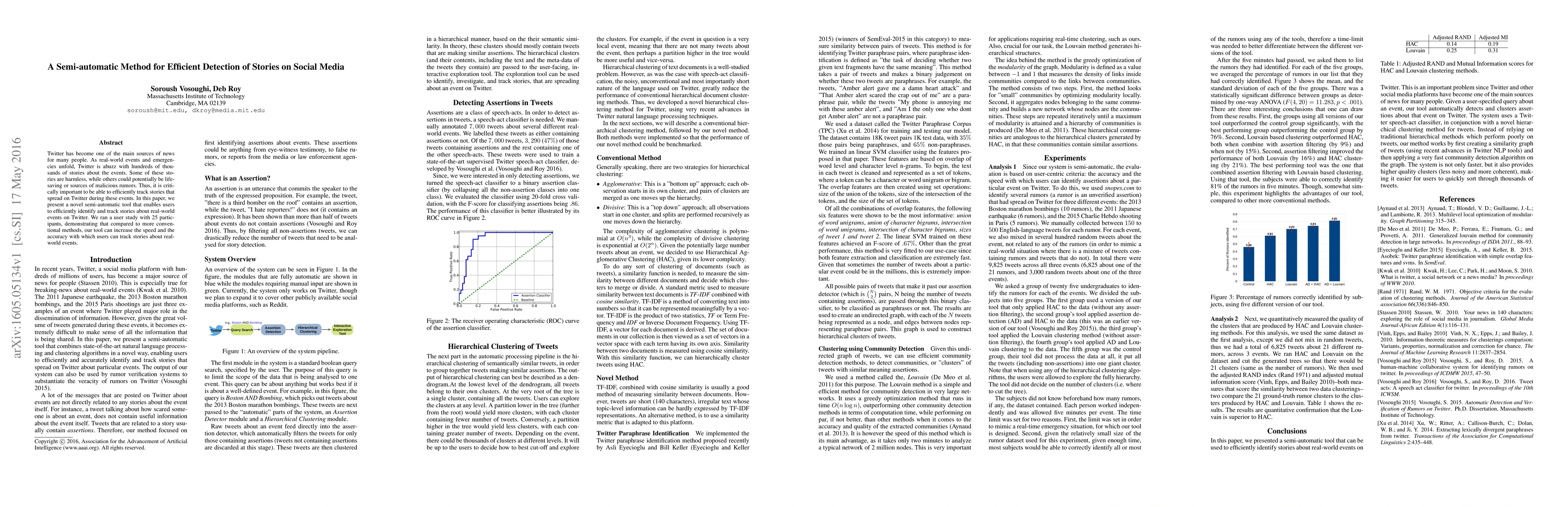 The paper presents a semi-automatic tool that combines a Twitter speech-act classifier with a novel hierarchical clustering method for tweets, utilizing recent advances in Twitter NLP techniques. The system filters non-assertion tweets, clusters semantically similar assertions, and uses community detection for identifying clusters of tweets with similar meaning assertions.