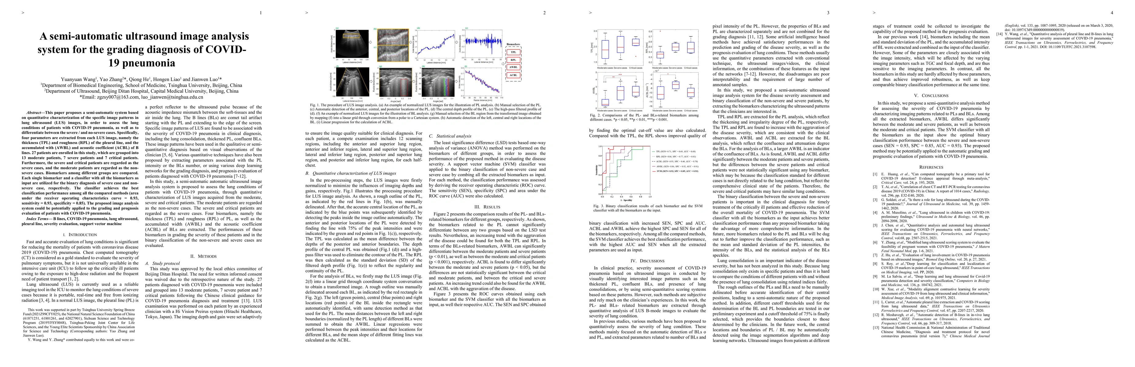 This paper introduces a semi-automatic ultrasound image analysis system that quantifies specific lung ultrasound patterns to grade COVID-19 pneumonia severity. The system uses four parameters to classify patients into severe and non-severe cases, achieving high classification performance with an AUC of 0.93, sensitivity of 0.93, and specificity of 0.85.