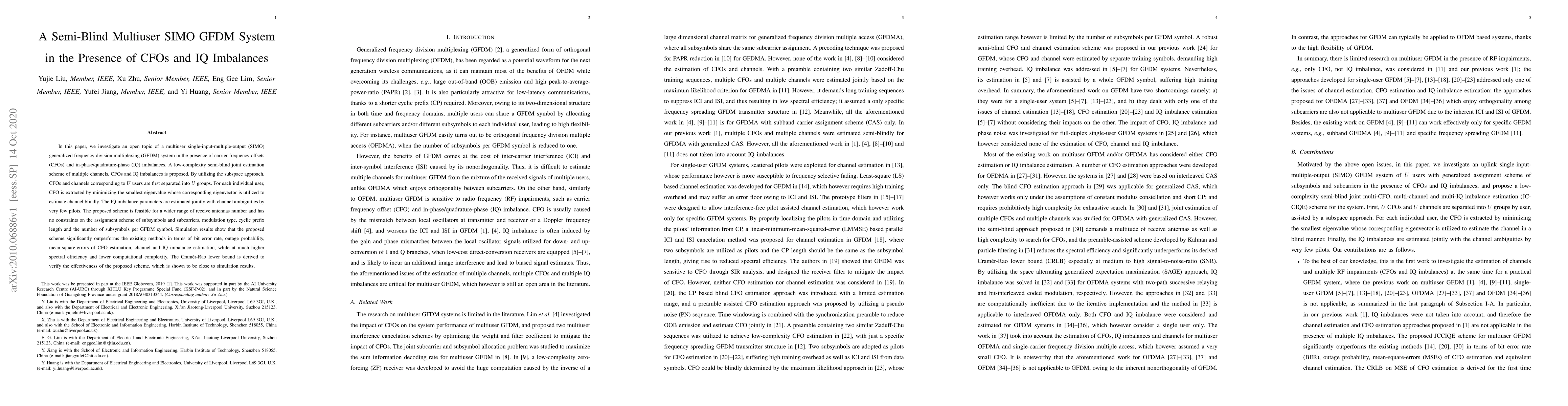 This paper proposes a low-complexity semi-blind joint estimation scheme for a multiuser SIMO GFDM system dealing with CFOs and IQ imbalances. The method significantly outperforms existing methods in terms of error rate and computational efficiency while maintaining high spectral efficiency.